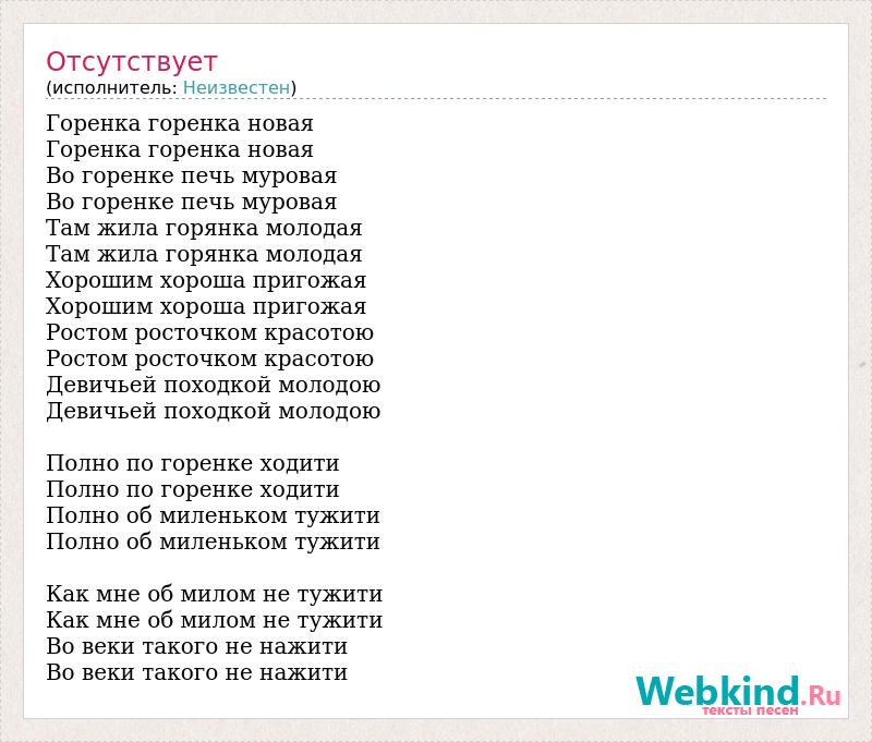 Горенка горенка новая Горенка горенка новая Во горенке печь муровая Во горенке печь муровая Там жила горянка молодая Там жила горянка молодая Хорошим хороша пригожая Хорошим хороша пригожая Ростом росточком красотою Ростом росточком красотою Девичьей походкой молодою Девичьей походкой молодою Полно по горенке ходити Полно по горенке ходити Полно об миленьком тужити Полно об миленьком тужити Как мне об милом не тужити Как мне об милом не тужити Во веки такого не нажити Во веки такого не нажити