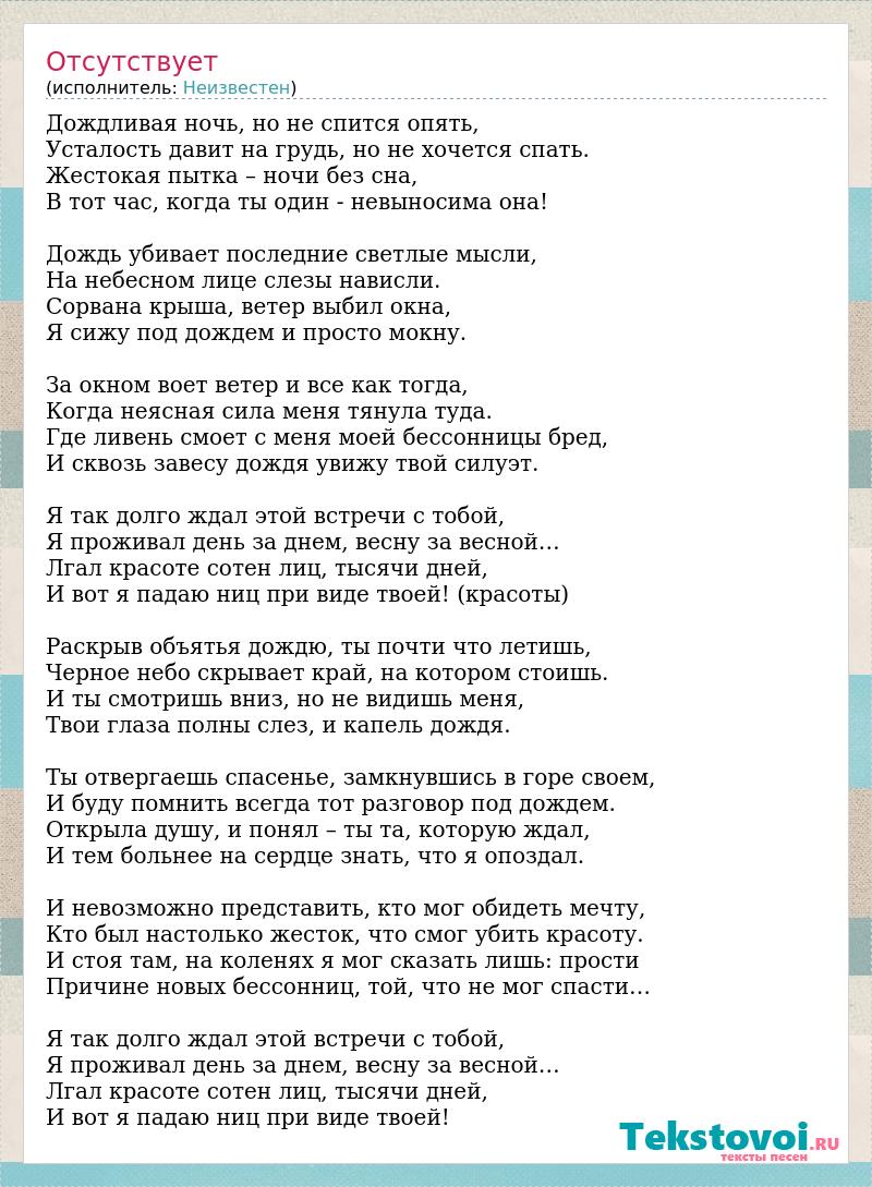 Дождливая ночь, но не спится опять, Усталость давит на грудь, но не хочется спать. Жестокая пытка – ночи без сна, В тот час, когда ты один - невыносима она! Дождь убивает последние светлые мысли, На небесном лице слезы нависли. Сорвана крыша, ветер выбил окна, Я сижу под дождем и просто мокну. За окном воет ветер и все как тогда, Когда неясная сила меня тянула туда. Где ливень смоет с меня моей бессонницы бред, И сквозь завесу дождя увижу твой силуэт. Я так долго ждал этой встречи с тобой, Я проживал день за днем, весну за весной… Лгал красоте сотен лиц, тысячи дней, И вот я падаю ниц при виде твоей! (красоты) Раскрыв объятья дождю, ты почти что летишь, Черное небо скрывает край, на котором стоишь. И ты смотришь вниз, но не видишь меня, Твои глаза полны слез, и капель дождя. Ты отвергаешь спасенье, замкнувшись в горе своем, И буду помнить всегда тот разговор под дождем. Открыла душу, и понял – ты та, которую ждал, И тем больнее на сердце знать, что я опоздал. И невозможно представить, кто мог обидеть мечту, Кто был настолько жесток, что смог убить красоту. И стоя там, на коленях я мог сказать лишь: прости Причине новых бессонниц, той, что не мог спасти… Я так долго ждал этой встречи с тобой, Я проживал день за днем, весну за весной… Лгал красоте сотен лиц, тысячи дней, И вот я падаю ниц при виде твоей!