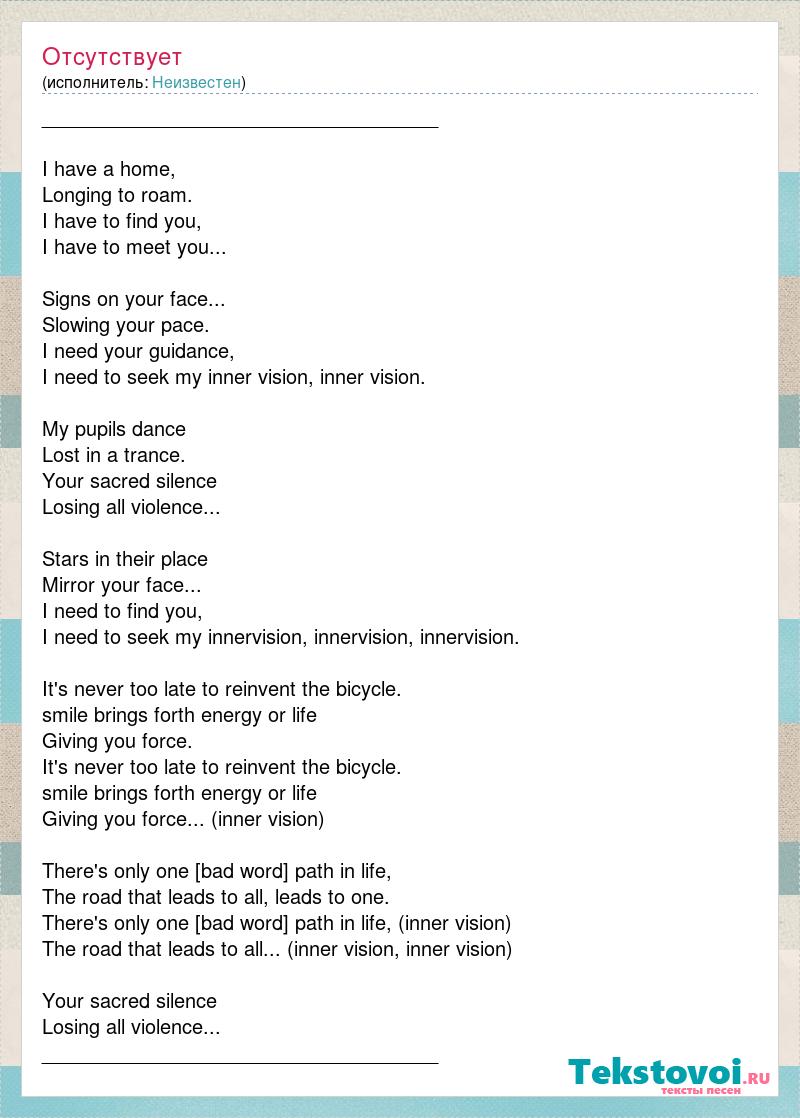 ____________________________________ I have a home, Longing to roam. I have to find you, I have to meet you... Signs on your face... Slowing your pace. I need your guidance, I need to seek my inner vision, inner vision. My pupils dance Lost in a trance. Your sacred silence Losing all violence... Stars in their place Mirror your face... I need to find you, I need to seek my innervision, innervision, innervision. It's never too late to reinvent the bicycle. smile brings forth energy or life Giving you force. It's never too late to reinvent the bicycle. smile brings forth energy or life Giving you force... (inner vision) There's only one [bad word] path in life, The road that leads to all, leads to one. There's only one [bad word] path in life, (inner vision) The road that leads to all... (inner vision, inner vision) Your sacred silence Losing all violence... ____________________________________