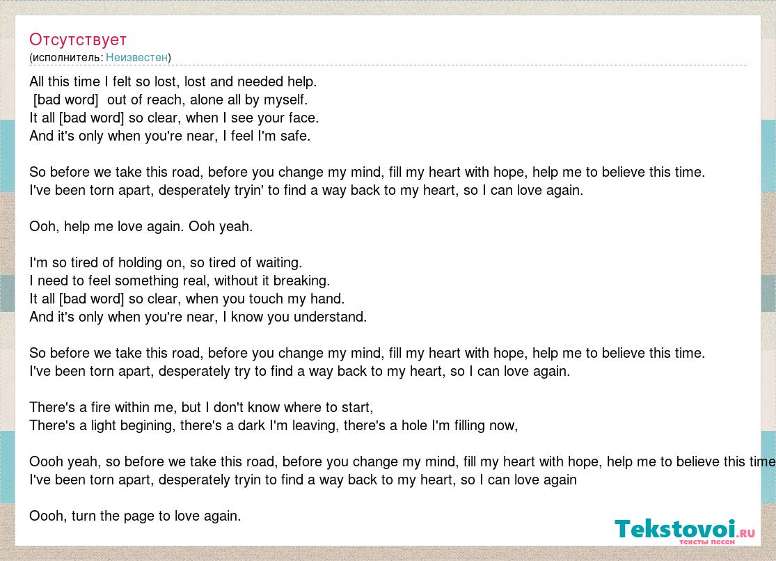 All this time I felt so lost, lost and needed help. [bad word] out of reach, alone all by myself. It all [bad word] so clear, when I see your face. And it's only when you're near, I feel I'm safe. So before we take this road, before you change my mind, fill my heart with hope, help me to believe this time. I've been torn apart, desperately tryin' to find a way back to my heart, so I can love again. Ooh, help me love again. Ooh yeah. I'm so tired of holding on, so tired of waiting. I need to feel something real, without it breaking. It all [bad word] so clear, when you touch my hand. And it's only when you're near, I know you understand. So before we take this road, before you change my mind, fill my heart with hope, help me to believe this time. I've been torn apart, desperately try to find a way back to my heart, so I can love again. There's a fire within me, but I don't know where to start, There's a light begining, there's a dark I'm leaving, there's a hole I'm filling now, Oooh yeah, so before we take this road, before you change my mind, fill my heart with hope, help me to believe this time I've been torn apart, desperately tryin to find a way back to my heart, so I can love again Oooh, turn the page to love again.