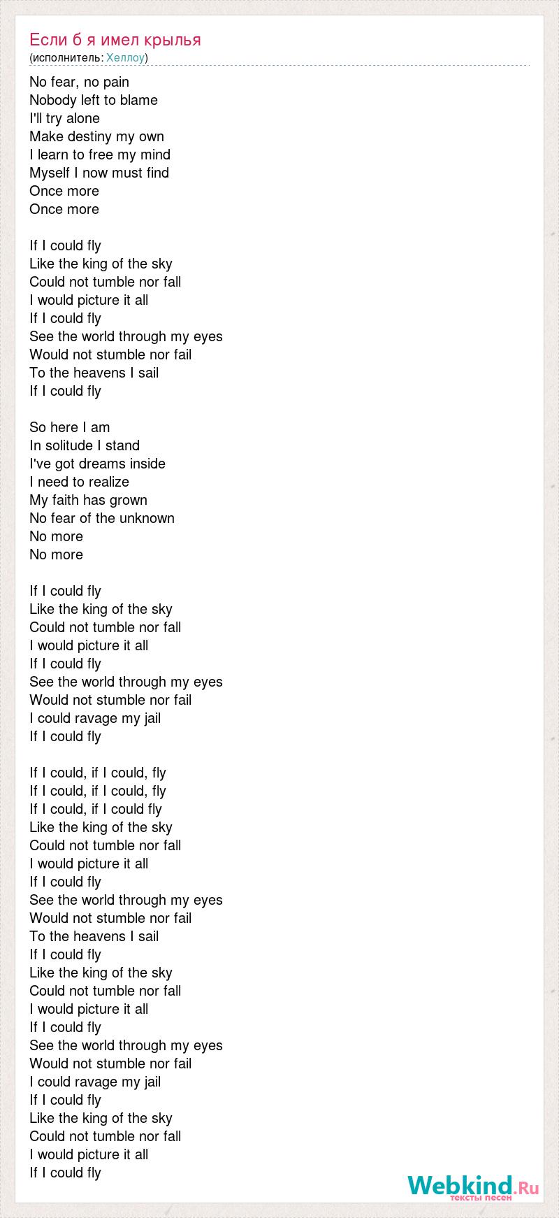 No fear, no pain Nobody left to blame I'll try alone Make destiny my own I learn to free my mind Myself I now must find Once more Once more If I could fly Like the king of the sky Could not tumble nor fall I would picture it all If I could fly See the world through my eyes Would not stumble nor fail To the heavens I sail If I could fly So here I am In solitude I stand I've got dreams inside I need to realize My faith has grown No fear of the unknown No more No more If I could fly Like the king of the sky Could not tumble nor fall I would picture it all If I could fly See the world through my eyes Would not stumble nor fail I could ravage my jail If I could fly If I could, if I could, fly If I could, if I could, fly If I could, if I could fly Like the king of the sky Could not tumble nor fall I would picture it all If I could fly See the world through my eyes Would not stumble nor fail To the heavens I sail If I could fly Like the king of the sky Could not tumble nor fall I would picture it all If I could fly See the world through my eyes Would not stumble nor fail I could ravage my jail If I could fly Like the king of the sky Could not tumble nor fall I would picture it all If I could fly