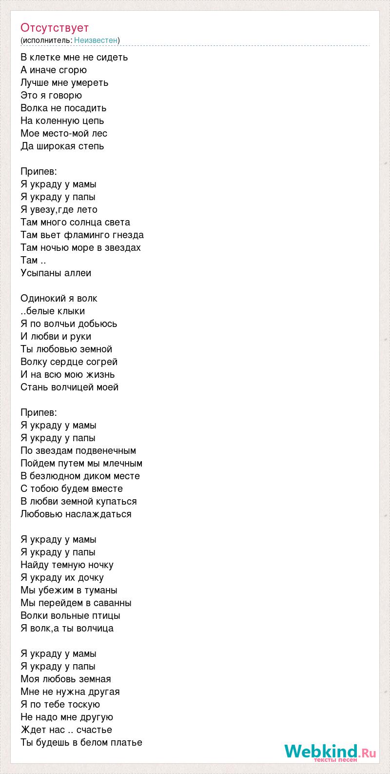 В клетке мне не сидеть А иначе сгорю Лучше мне умереть Это я говорю Волка не посадить На коленную цепь Мое место-мой лес Да широкая степь Припев: Я украду у мамы Я украду у папы Я увезу,где лето Там много солнца света Там вьет фламинго гнезда Там ночью море в звездах Там .. Усыпаны аллеи Одинокий я волк ..белые клыки Я по волчьи добьюсь И любви и руки Ты любовью земной Волку сердце согрей И на всю мою жизнь Стань волчицей моей Припев: Я украду у мамы Я украду у папы По звездам подвенечным Пойдем путем мы млечным В безлюдном диком месте С тобою будем вместе В любви земной купаться Любовью наслаждаться Я украду у мамы Я украду у папы Найду темную ночку Я украду их дочку Мы убежим в туманы Мы перейдем в саванны Волки вольные птицы Я волк,а ты волчица Я украду у мамы Я украду у папы Моя любовь земная Мне не нужна другая Я по тебе тоскую Не надо мне другую Ждет нас .. счастье Ты будешь в белом платье