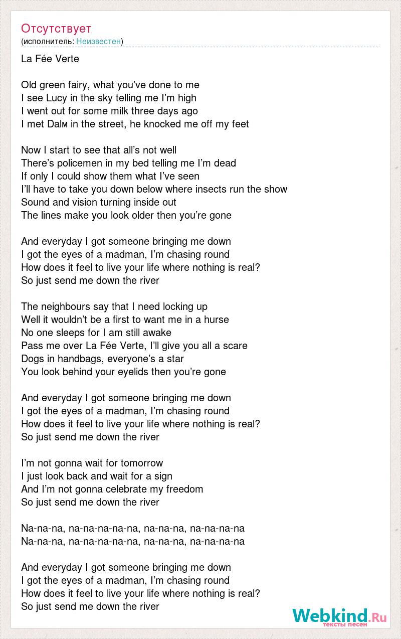 La Fée Verte Old green fairy, what you’ve done to me I see Lucy in the sky telling me I’m high I went out for some milk three days ago I met Dalм in the street, he knocked me off my feet Now I start to see that all’s not well There’s policemen in my bed telling me I’m dead If only I could show them what I’ve seen I’ll have to take you down below where [bad word] the show Sound and vision turning inside out The lines make you look older then you’re gone And everyday I got someone bringing me down I got the eyes of a madman, I’m chasing round How does it feel to live your life where nothing is real? So just send me down the river The neighbours say that I need locking up Well it wouldn’t be a first to want me in a hurse No one sleeps for I am still awake Pass me over La Fée Verte, I’ll give you all a scare Dogs in handbags, everyone’s a star You look behind your eyelids then you’re gone And everyday I got someone bringing me down I got the eyes of a madman, I’m chasing round How does it feel to live your life where nothing is real? So just send me down the river I’m not gonna wait for tomorrow I just look back and wait for a sign And I’m not gonna celebrate my freedom So just send me down the river Na-na-na, na-na-na-na-na, na-na-na, na-na-na-na Na-na-na, na-na-na-na-na, na-na-na, na-na-na-na And everyday I got someone bringing me down I got the eyes of a madman, I’m chasing round How does it feel to live your life where nothing is real? So just send me down the river