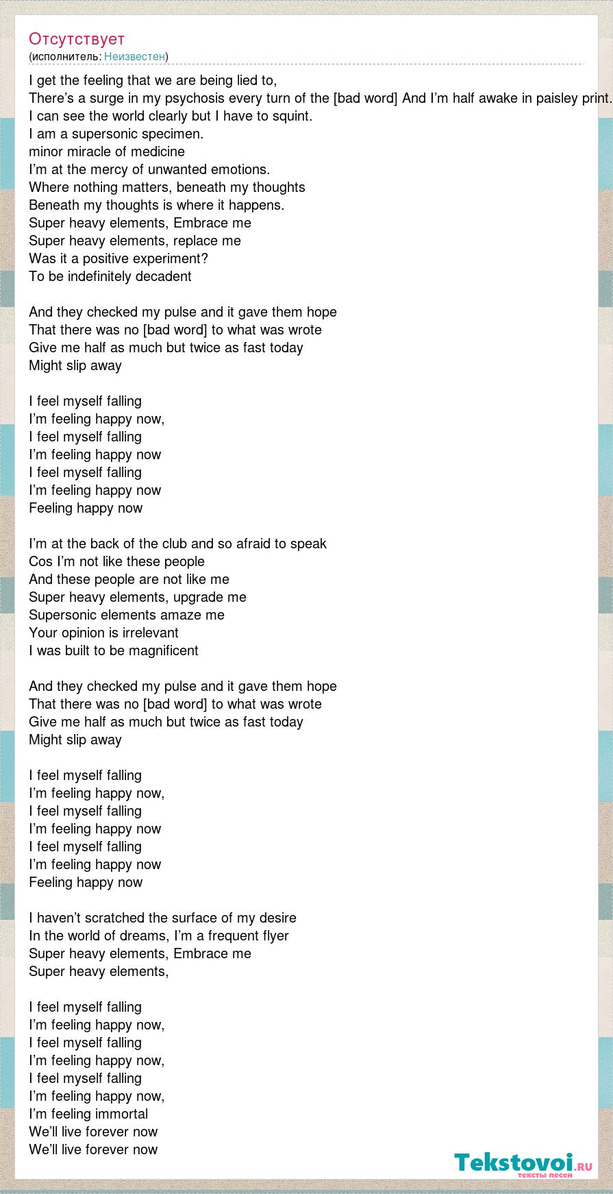 I get the feeling that we are being lied to, There’s a surge in my psychosis every turn of the [bad word] And I’m half awake in paisley print. I can see the world clearly but I have to squint. I am a supersonic specimen. minor miracle of medicine I’m at the mercy of unwanted emotions. Where nothing matters, beneath my thoughts Beneath my thoughts is where it happens. Super heavy elements, Embrace me Super heavy elements, replace me Was it a positive experiment? To be indefinitely decadent And they checked my pulse and it gave them hope That there was no [bad word] to what was wrote Give me half as much but twice as fast today Might slip away I feel myself falling I’m feeling happy now, I feel myself falling I’m feeling happy now I feel myself falling I’m feeling happy now Feeling happy now I’m at the back of the club and so afraid to speak Cos I’m not like these people And these people are not like me Super heavy elements, upgrade me Supersonic elements amaze me Your opinion is irrelevant I was built to be magnificent And they checked my pulse and it gave them hope That there was no [bad word] to what was wrote Give me half as much but twice as fast today Might slip away I feel myself falling I’m feeling happy now, I feel myself falling I’m feeling happy now I feel myself falling I’m feeling happy now Feeling happy now I haven’t scratched the surface of my desire In the world of dreams, I’m a frequent flyer Super heavy elements, Embrace me Super heavy elements, I feel myself falling I’m feeling happy now, I feel myself falling I’m feeling happy now, I feel myself falling I’m feeling happy now, I’m feeling immortal We’ll live forever now We’ll live forever now