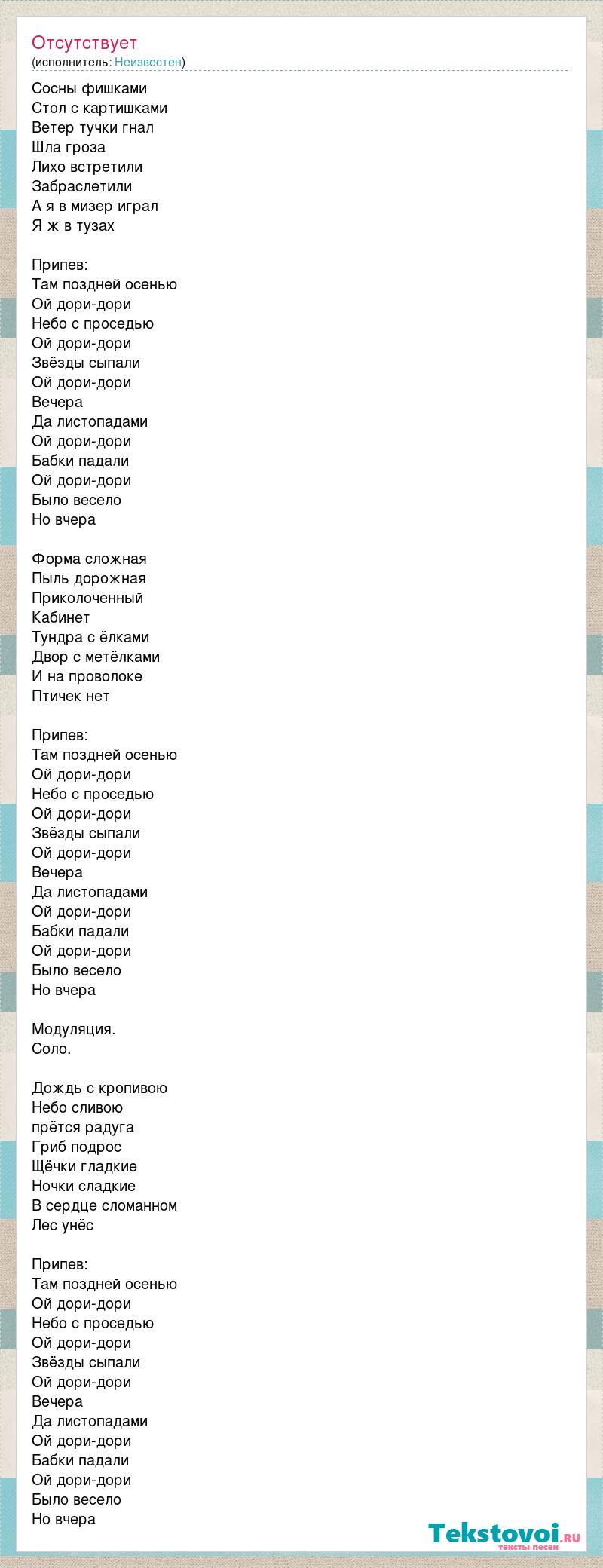 Сосны фишками Стол с картишками Ветер тучки гнал Шла гроза Лихо встретили Забраслетили А я в мизер играл Я ж в тузах Припев: Там поздней осенью Ой дори-дори Небо с проседью Ой дори-дори Звёзды сыпали Ой дори-дори Вечера Да листопадами Ой дори-дори Бабки падали Ой дори-дори Было весело Но вчера Форма сложная Пыль дорожная Приколоченный Кабинет Тундра с ёлками Двор с метёлками И на проволоке Птичек нет Припев: Там поздней осенью Ой дори-дори Небо с проседью Ой дори-дори Звёзды сыпали Ой дори-дори Вечера Да листопадами Ой дори-дори Бабки падали Ой дори-дори Было весело Но вчера Модуляция. Соло. Дождь с кропивою Небо сливою прётся радуга Гриб подрос Щёчки гладкие Ночки сладкие В сердце сломанном Лес унёс Припев: Там поздней осенью Ой дори-дори Небо с проседью Ой дори-дори Звёзды сыпали Ой дори-дори Вечера Да листопадами Ой дори-дори Бабки падали Ой дори-дори Было весело Но вчера
