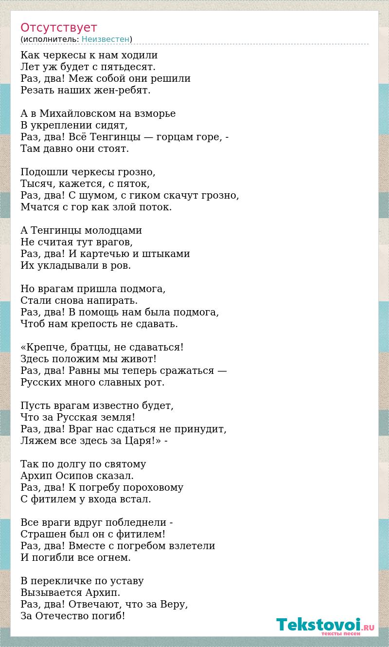 Как черкесы к нам ходили Лет уж будет с пятьдесят. Раз, два! Меж собой они решили Резать наших жен-ребят. А в Михайловском на взморье В укреплении сидят, Раз, два! Всё Тенгинцы — горцам горе, - Там давно они стоят. Подошли черкесы грозно, Тысяч, кажется, с пяток, Раз, два! С шумом, с гиком скачут грозно, Мчатся с гор как злой поток. А Тенгинцы молодцами Не считая тут врагов, Раз, два! И картечью и штыками Их укладывали в ров. Но врагам пришла подмога, Стали снова напирать. Раз, два! В помощь нам была подмога, Чтоб нам крепость не сдавать. «Крепче, братцы, не сдаваться! Здесь положим мы живот! Раз, два! Равны мы теперь сражаться — Русских много славных рот. Пусть врагам известно будет, Что за Русская земля! Раз, два! Враг нас сдаться не принудит, Ляжем все здесь за Царя!» - Так по долгу по святому Архип Осипов сказал. Раз, два! К погребу пороховому С фитилем у входа встал. Все враги вдруг побледнели - Страшен был он с фитилем! Раз, два! Вместе с погребом взлетели И погибли все огнем. В перекличке по уставу Вызывается Архип. Раз, два! Отвечают, что за Веру, За Отечество погиб!