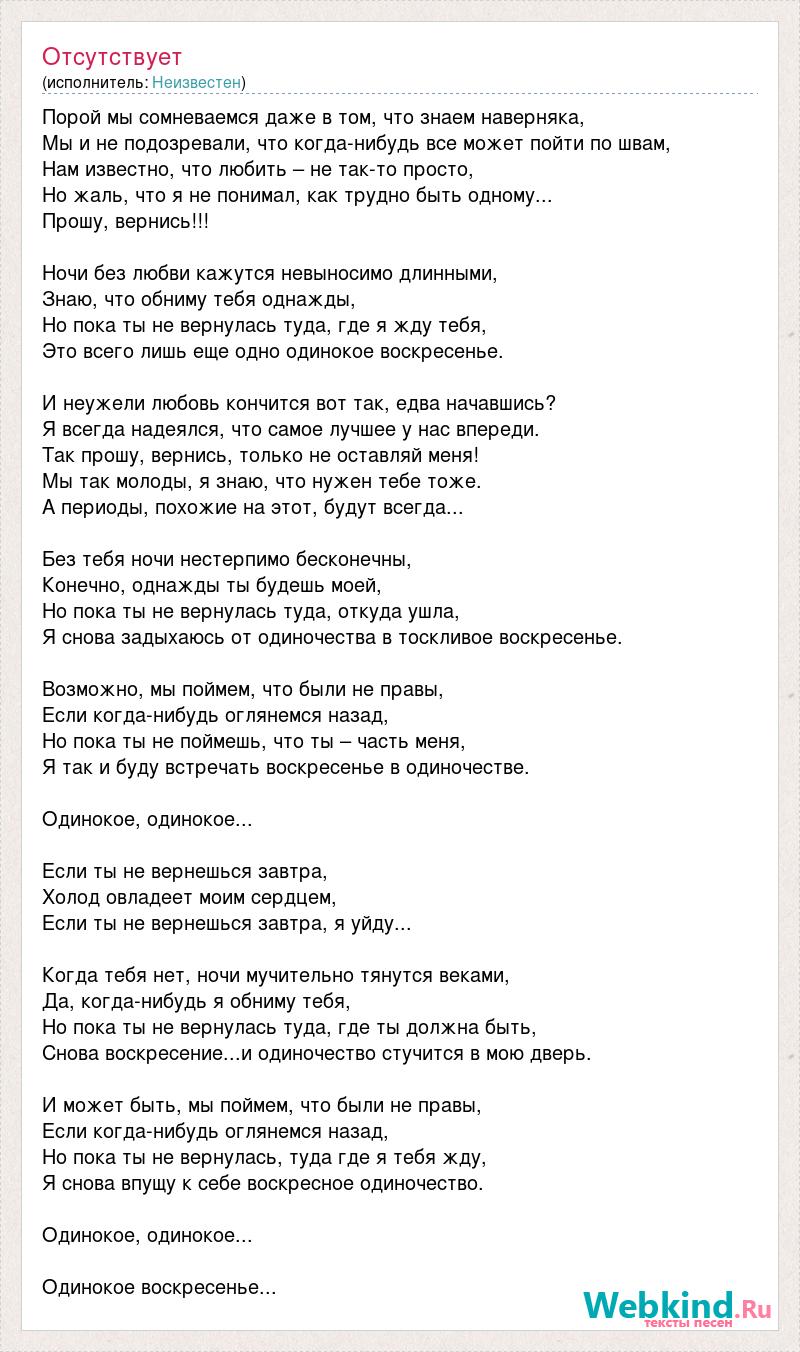 Порой мы сомневаемся даже в том, что знаем наверняка, Мы и не подозревали, что когда-нибудь все может пойти по швам, Нам известно, что любить – не так-то просто, Но жаль, что я не понимал, как трудно быть одному... Прошу, вернись!!! Ночи без любви кажутся невыносимо длинными, Знаю, что обниму тебя однажды, Но пока ты не вернулась туда, где я жду тебя, Это всего лишь еще одно одинокое воскресенье. И неужели любовь кончится вот так, едва начавшись? Я всегда надеялся, что самое лучшее у нас впереди. Так прошу, вернись, только не оставляй меня! Мы так молоды, я знаю, что нужен тебе тоже. А периоды, похожие на этот, будут всегда... Без тебя ночи нестерпимо бесконечны, Конечно, однажды ты будешь моей, Но пока ты не вернулась туда, откуда ушла, Я снова задыхаюсь от одиночества в тоскливое воскресенье. Возможно, мы поймем, что были не правы, Если когда-нибудь оглянемся назад, Но пока ты не поймешь, что ты – часть меня, Я так и буду встречать воскресенье в одиночестве. Одинокое, одинокое... Если ты не вернешься завтра, Холод овладеет моим сердцем, Если ты не вернешься завтра, я уйду... Когда тебя нет, ночи мучительно тянутся веками, Да, когда-нибудь я обниму тебя, Но пока ты не вернулась туда, где ты должна быть, Снова воскресение...и одиночество стучится в мою дверь. И может быть, мы поймем, что были не правы, Если когда-нибудь оглянемся назад, Но пока ты не вернулась, туда где я тебя жду, Я снова впущу к себе воскресное одиночество. Одинокое, одинокое... Одинокое воскресенье...