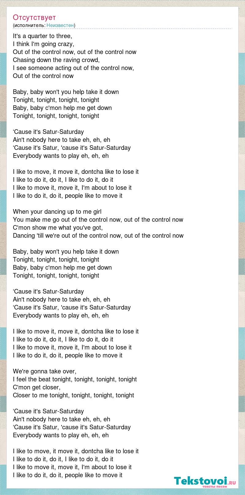 It's a quarter to three, I think I'm going crazy, Out of the control now, out of the control now Chasing down the raving crowd, I see someone acting out of the control now, Out of the control now Baby, baby won't you help take it down Tonight, tonight, tonight, tonight Baby, baby c'mon help me get down Tonight, tonight, tonight, tonight ‘Cause it's Satur-Saturday Ain't nobody here to take eh, eh, eh ‘Cause it's Satur, 'cause it's Satur-Saturday Everybody wants to play eh, eh, eh I like to move, it move it, dontcha like to lose it I like to do it, do it, I like to do it, do it I like to move it, move it, I'm about to lose it I like to do it, do it, people like to move it When your dancing up to me girl You make me go out of the control now, out of the control now C'mon show me what you've got, Dancing 'till we're out of the control now, out of the control now Baby, baby won't you help take it down Tonight, tonight, tonight, tonight Baby, baby c'mon help me get down Tonight, tonight, tonight, tonight ‘Cause it's Satur-Saturday Ain't nobody here to take eh, eh, eh ‘Cause it's Satur, 'cause it's Satur-Saturday Everybody wants to play eh, eh, eh I like to move it, move it, dontcha like to lose it I like to do it, do it, I like to do it, do it I like to move it, move it, I'm about to lose it I like to do it, do it, people like to move it We're gonna take over, I feel the beat tonight, tonight, tonight, tonight C'mon get closer, Closer to me tonight, tonight, tonight, tonight ‘Cause it's Satur-Saturday Ain't nobody here to take eh, eh, eh ‘Cause it's Satur, 'cause it's Satur-Saturday Everybody wants to play eh, eh, eh I like to move, it move it, dontcha like to lose it I like to do it, do it, I like to do it, do it I like to move it, move it, I'm about to lose it I like to do it, do it, people like to move іt