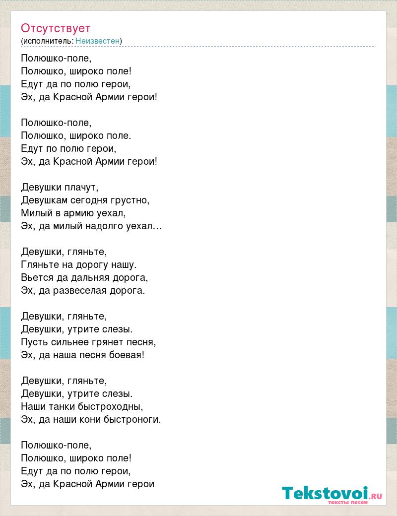 Полюшко-поле, Полюшко, широко поле! Едут да по полю герои, Эх, да Красной Армии герои! Полюшко-поле, Полюшко, широко поле. Едут по полю герои, Эх, да Красной Армии герои! Девушки плачут, Девушкам сегодня грустно, Милый в армию уехал, Эх, да милый надолго уехал… Девушки, гляньте, Гляньте на дорогу нашу. Вьется да дальняя дорога, Эх, да развеселая дорога. Девушки, гляньте, Девушки, утрите слезы. Пусть сильнее грянет песня, Эх, да наша песня боевая! Девушки, гляньте, Девушки, утрите слезы. Наши танки быстроходны, Эх, да наши кони быстроноги. Полюшко-поле, Полюшко, широко поле! Едут да по полю герои, Эх, да Красной Армии герои