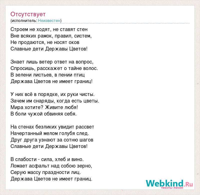 Строем не ходят, не ставят стен Вне всяких рамок, правил, систем, Не продаются, не носят оков Славные дети Державы Цветов! Знает лишь ветер ответ на вопрос, Спросишь, расскажет о тайне волос. В зелени листьев, в пении птиц Держава Цветов не имеет границ! У них всё в порядке, их руки чисты. Зачем им снаряды, когда есть цветы. Мира хотите? Живите любя! В боли чужой обвиняя себя. На стенах безликих увидит рассвет Начертанный мелом голубя след. Друг друга узнают за сотню шагов Славные дети Державы Цветов! В слабости - сила, хлеб и вино. Ломает асфальт над собою зерно, Серую массу праздности лиц. Держава Цветов не имеет границ.