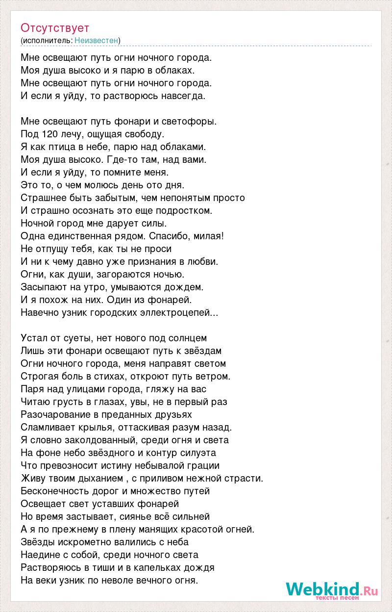 Мне освещают путь огни ночного города. Моя душа высоко и я парю в облаках. Мне освещают путь огни ночного города. И если я уйду, то растворюсь навсегда. Мне освещают путь фонари и светофоры. Под 120 лечу, ощущая свободу. Я как птица в небе, парю над облаками. Моя душа высоко. Где-то там, над вами. И если я уйду, то помните меня. Это то, о чем молюсь день ото дня. Страшнее быть забытым, чем непонятым просто И страшно осознать это еще подростком. Ночной город мне дарует силы. Одна единственная рядом. Спасибо, милая! Не отпущу тебя, как ты не проси И ни к чему давно уже признания в любви. Огни, как души, загораются ночью. Засыпают на утро, умываются дождем. И я похож на них. Один из фонарей. Навечно узник городских эллектроцепей... Устал от суеты, нет нового под солнцем Лишь эти фонари освещают путь к звёздам Огни ночного города, меня направят светом Строгая боль в стихах, откроют путь ветром. Паря над улицами города, гляжу на вас Читаю грусть в глазах, увы, не в первый раз Разочарование в преданных друзьях Сламливает крылья, оттаскивая разум назад. Я словно заколдованный, среди огня и света На фоне небо звёздного и контур силуэта Что превозносит истину небывалой грации Живу твоим дыханием , с приливом нежной страсти. Бесконечность дорог и множество путей Освещает свет уставших фонарей Но время застывает, сиянье всё сильней А я по прежнему в плену манящих красотой огней. Звёзды искрометно валились с неба Наедине с собой, среди ночного света Растворяюсь в тиши и в капельках дождя На веки узник по неволе вечного огня.