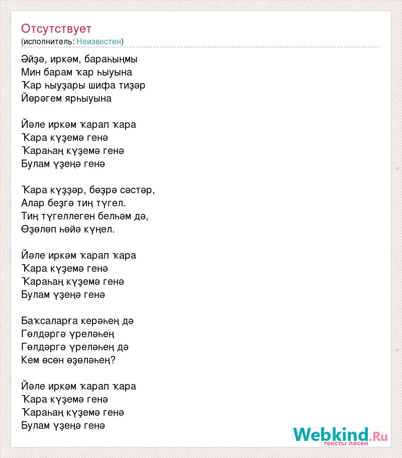 Әйҙә, иркәм, бараһыңмы Мин барам ҡар һыуына Ҡар һыуҙары шифа тиҙәр Йөрәгем ярһыуына Йәле иркәм ҡарап ҡара Ҡара күҙемә генә Ҡараһаң күҙемә генә Булам үҙеңә генә Ҡара күҙҙәр, бөҙрә сәстәр, Алар беҙгә тиң түгел. Тиң түгеллеген белһәм дә, Өҙөлөп һөйә күңел. Йәле иркәм ҡарап ҡара Ҡара күҙемә генә Ҡараһаң күҙемә генә Булам үҙеңә генә Баҡсаларға керәһең дә Гөлдәргә үреләһең Гөлдәргә үреләһең дә Кем өсөн өҙөләһең? Йәле иркәм ҡарап ҡара Ҡара күҙемә генә Ҡараһаң күҙемә генә Булам үҙеңә генә