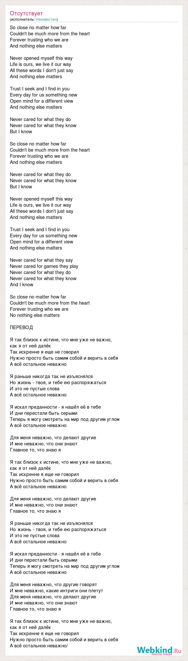 So close no matter how far Couldn't be much more from the heart Forever [bad word] who we are And nothing else matters Never opened myself this way Life is ours, we live it our way All these words I don't just say And nothing else matters [bad word] I seek and I find in you Every day for us something new Open mind for a different view And nothing else matters Never cared for what they do Never cared for what they know But I know So close no matter how far Couldn't be much more from the heart Forever [bad word] who we are And nothing else matters Never cared for what they do Never cared for what they know But I know Never opened myself this way Life is ours, we live it our way All these words I don't just say And nothing else matters [bad word] I seek and I find in you Every day for us something new Open mind for a different view And nothing else matters Never cared for what they say Never cared for games they play Never cared for what they do Never cared for what they know And I know So close no matter how far Couldn't be much more from the heart Forever [bad word] who we are No nothing else matters ПЕРЕВОД Я так близок к истине, что мне уже не важно, как я от неё далёк Так искренне я еще не говорил Нужно просто быть самим собой и верить в себя А всё остальное неважно Я раньше никогда так не изъяснялся Но жизнь - твоя, и тебе ею распоряжаться И это не пустые слова А всё остальное неважно Я искал преданности - я нашёл её в тебе И дни перестали быть серыми Теперь я могу смотреть на мир под другим углом А всё остальное неважно Для меня неважно, что делают другие И мне неважно, что они знают Главное то, что знаю я Я так близок к истине, что мне уже не важно, как я от неё далёк Так искренне я еще не говорил Нужно просто быть самим собой и верить в себя А всё остальное неважно Для меня неважно, что делают другие И мне неважно, что они знают Главное то, что знаю я Я раньше никогда так не изъяснялся Но жизнь - твоя, и тебе ею распоряжаться И это не пустые слова А всё остальное неважно Я искал преданности - я нашёл её в тебе И дни перестали быть серыми Теперь я могу смотреть на мир под другим углом А всё остальное неважно Для меня неважно, что другие говорят И мне неважно, какие интриги они плетут Для меня неважно, что делают другие И мне неважно, что они знают Главное то, что знаю я Я так близок к истине, что мне уже не важно, как я от неё далёк Так искренне я еще не говорил Нужно просто быть самим собой и верить в себя А всё остальное неважно/