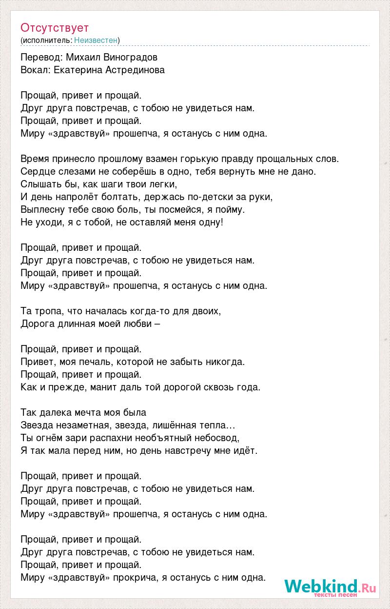 Перевод: Михаил Виноградов Вокал: Екатерина Астрединова Прощай, привет и прощай. Друг друга повстречав, с тобою не увидеться нам. Прощай, привет и прощай. Миру «здравствуй» прошепча, я останусь с ним одна. Время принесло прошлому взамен горькую правду прощальных слов. Сердце слезами не соберёшь в одно, тебя вернуть мне не дано. Слышать бы, как шаги твои легки, И день напролёт болтать, держась по-детски за руки, Выплесну тебе свою боль, ты посмейся, я пойму. Не уходи, я с тобой, не оставляй меня одну! Прощай, привет и прощай. Друг друга повстречав, с тобою не увидеться нам. Прощай, привет и прощай. Миру «здравствуй» прошепча, я останусь с ним одна. Та тропа, что началась когда-то для двоих, Дорога длинная моей любви – Прощай, привет и прощай. Привет, моя печаль, которой не забыть никогда. Прощай, привет и прощай. Как и прежде, манит даль той дорогой сквозь года. Так далека мечта моя была Звезда незаметная, звезда, лишённая тепла… Ты огнём зари распахни необъятный небосвод, Я так мала перед ним, но день навстречу мне идёт. Прощай, привет и прощай. Друг друга повстречав, с тобою не увидеться нам. Прощай, привет и прощай. Миру «здравствуй» прошепча, я останусь с ним одна. Прощай, привет и прощай. Друг друга повстречав, с тобою не увидеться нам. Прощай, привет и прощай. Миру «здравствуй» прокрича, я останусь с ним одна.