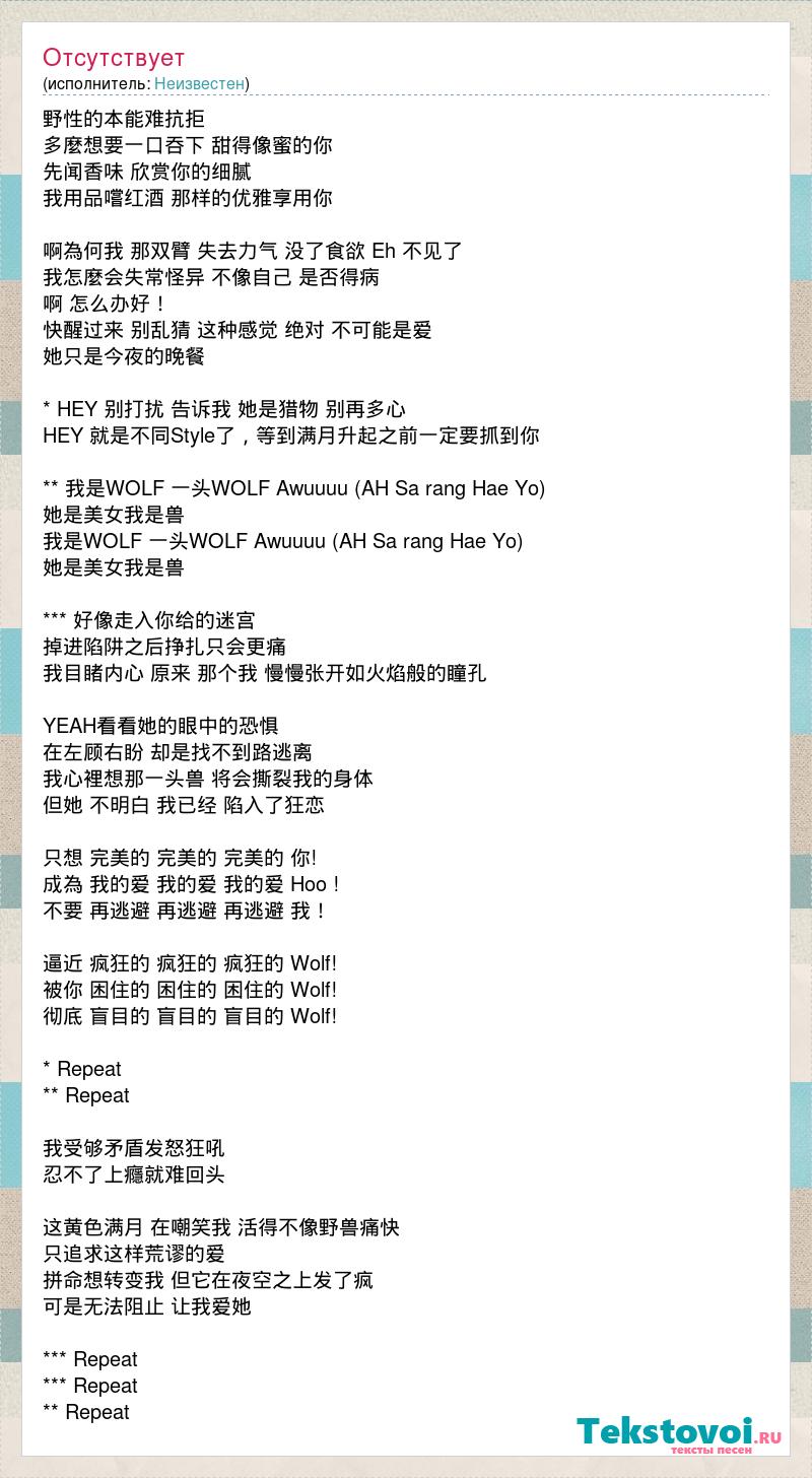 野性的本能难抗拒 多麼想要一口吞下 甜得像蜜的你 先闻香味 欣赏你的细腻 我用品嚐红酒 那样的优雅享用你 啊為何我 那双臂 失去力气 没了食欲 Eh 不见了 我怎麼会失常怪异 不像自己 是否得病 啊 怎么办好! 快醒过来 别乱猜 这种感觉 绝对 不可能是爱 她只是今夜的晚餐 * HEY 别打扰 告诉我 她是猎物 别再多心 HEY 就是不同Style了,等到满月升起之前一定要抓到你 ** 我是WOLF 一头WOLF Awuuuu (AH Sa rang Hae Yo) 她是美女我是兽 我是WOLF 一头WOLF Awuuuu (AH Sa rang Hae Yo) 她是美女我是兽 *** 好像走入你给的迷宫 掉进陷阱之后挣扎只会更痛 我目睹内心 原来 那个我 慢慢张开如火焰般的瞳孔 YEAH看看她的眼中的恐惧 在左顾右盼 却是找不到路逃离 我心裡想那一头兽 将会撕裂我的身体 但她 不明白 我已经 陷入了狂恋 只想 完美的 完美的 完美的 你! 成為 我的爱 我的爱 我的爱 Hoo ! 不要 再逃避 再逃避 再逃避 我! 逼近 疯狂的 疯狂的 疯狂的 Wolf! 被你 困住的 困住的 困住的 Wolf! 彻底 盲目的 盲目的 盲目的 Wolf! * Repeat ** Repeat 我受够矛盾发怒狂吼 忍不了上癮就难回头 这黄色满月 在嘲笑我 活得不像野兽痛快 只追求这样荒谬的爱 拼命想转变我 但它在夜空之上发了疯 可是无法阻止 让我爱她 *** Repeat *** Repeat ** Repeat