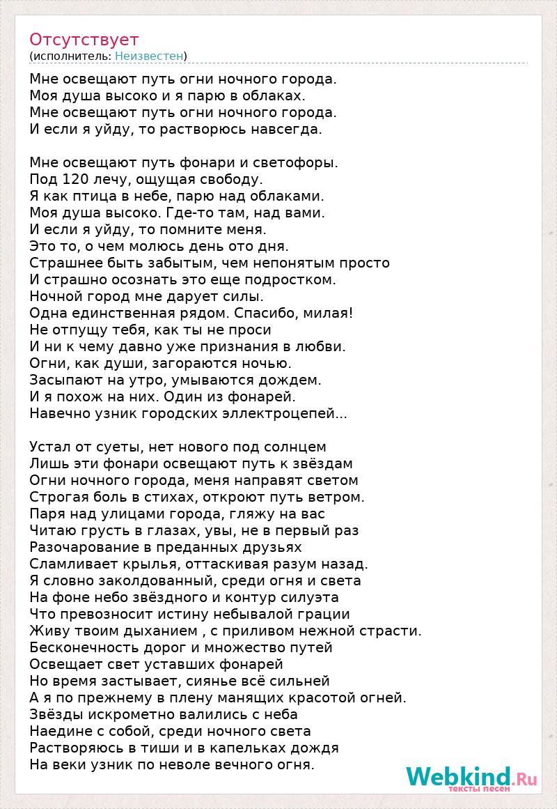 Мне освещают путь огни ночного города. Моя душа высоко и я парю в облаках. Мне освещают путь огни ночного города. И если я уйду, то растворюсь навсегда. Мне освещают путь фонари и светофоры. Под 120 лечу, ощущая свободу. Я как птица в небе, парю над облаками. Моя душа высоко. Где-то там, над вами. И если я уйду, то помните меня. Это то, о чем молюсь день ото дня. Страшнее быть забытым, чем непонятым просто И страшно осознать это еще подростком. Ночной город мне дарует силы. Одна единственная рядом. Спасибо, милая! Не отпущу тебя, как ты не проси И ни к чему давно уже признания в любви. Огни, как души, загораются ночью. Засыпают на утро, умываются дождем. И я похож на них. Один из фонарей. Навечно узник городских эллектроцепей... Устал от суеты, нет нового под солнцем Лишь эти фонари освещают путь к звёздам Огни ночного города, меня направят светом Строгая боль в стихах, откроют путь ветром. Паря над улицами города, гляжу на вас Читаю грусть в глазах, увы, не в первый раз Разочарование в преданных друзьях Сламливает крылья, оттаскивая разум назад. Я словно заколдованный, среди огня и света На фоне небо звёздного и контур силуэта Что превозносит истину небывалой грации Живу твоим дыханием , с приливом нежной страсти. Бесконечность дорог и множество путей Освещает свет уставших фонарей Но время застывает, сиянье всё сильней А я по прежнему в плену манящих красотой огней. Звёзды искрометно валились с неба Наедине с собой, среди ночного света Растворяюсь в тиши и в капельках дождя На веки узник по неволе вечного огня.