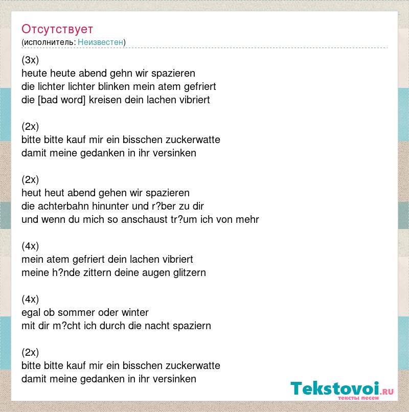 (3x) heute heute abend gehn wir spazieren die lichter lichter blinken mein atem gefriert die [bad word] kreisen dein lachen vibriert (2x) bitte bitte kauf mir ein bisschen zuckerwatte damit meine gedanken in ihr versinken (2x) heut heut abend gehen wir spazieren die achterbahn hinunter und r?ber zu dir und wenn du mich so anschaust tr?um ich von mehr (4x) mein atem gefriert dein lachen vibriert meine h?nde zittern deine augen glitzern (4x) egal ob sommer oder winter mit dir m?cht ich durch die nacht spaziern (2x) bitte bitte kauf mir ein bisschen zuckerwatte damit meine gedanken in ihr versinken