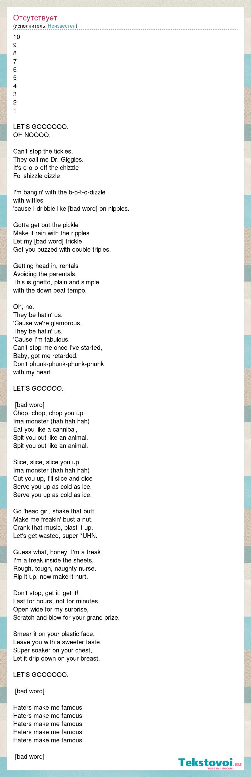10 9 8 7 6 5 4 3 2 1 LET'S GOOOOOO. OH NOOOO. Can't stop the tickles. They call me Dr. Giggles. It's o-o-o-off the chizzle Fo' shizzle dizzle I'm bangin' with the b-o-t-o-dizzle with wiffles 'cause I dribble like [bad word] on nipples. Gotta get out the pickle Make it rain with the ripples. Let my [bad word] trickle Get you buzzed with double triples. Getting head in, rentals Avoiding the parentals. This is ghetto, plain and simple with the down beat tempo. Oh, no. They be hatin' us. 'Cause we're glamorous. They be hatin' us. 'Cause I'm fabulous. Can't stop me once I've started, Baby, got me retarded. Don't phunk-phunk-phunk-phunk with my heart. LET'S GOOOOO. [bad word] Chop, chop, chop you up. Ima monster (hah hah hah) Eat you like a cannibal, Spit you out like an animal. Spit you out like an animal. Slice, slice, slice you up. Ima monster (hah hah hah) Cut you up, I'll slice and dice Serve you up as cold as ice. Serve you up as cold as ice. Go 'head girl, shake that butt. Make me freakin' bust a nut. Crank that music, blast it up. Let's get wasted, super *UHN. Guess what, honey. I'm a freak. I'm a freak inside the sheets. Rough, tough, naughty nurse. Rip it up, now make it hurt. Don't stop, get it, get it! Last for hours, not for minutes. Open wide for my surprise, Scratch and blow for your grand prize. Smear it on your plastic face, Leave you with a sweeter taste. Super soaker on your chest, Let it drip down on your breast. LET'S GOOOOOO. [bad word] Haters make me famous Haters make me famous Haters make me famous Haters make me famous Haters make me famous [bad word]