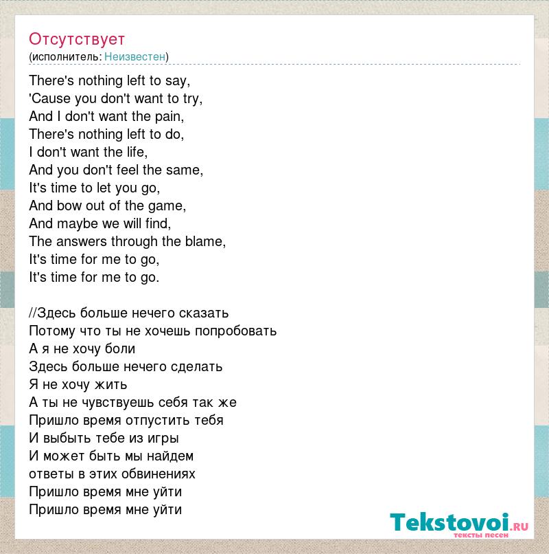 There's nothing left to say, 'Cause you don't want to try, And I don't want the pain, There's nothing left to do, I don't want the life, And you don't feel the same, It's time to let you go, And bow out of the game, And maybe we will find, The answers through the blame, It's time for me to go, It's time for me to go. //Здесь больше нечего сказать Потому что ты не хочешь попробовать А я не хочу боли Здесь больше нечего сделать Я не хочу жить А ты не чувствуешь себя так же Пришло время отпустить тебя И выбыть тебе из игры И может быть мы найдем ответы в этих обвинениях Пришло время мне уйти Пришло время мне уйти