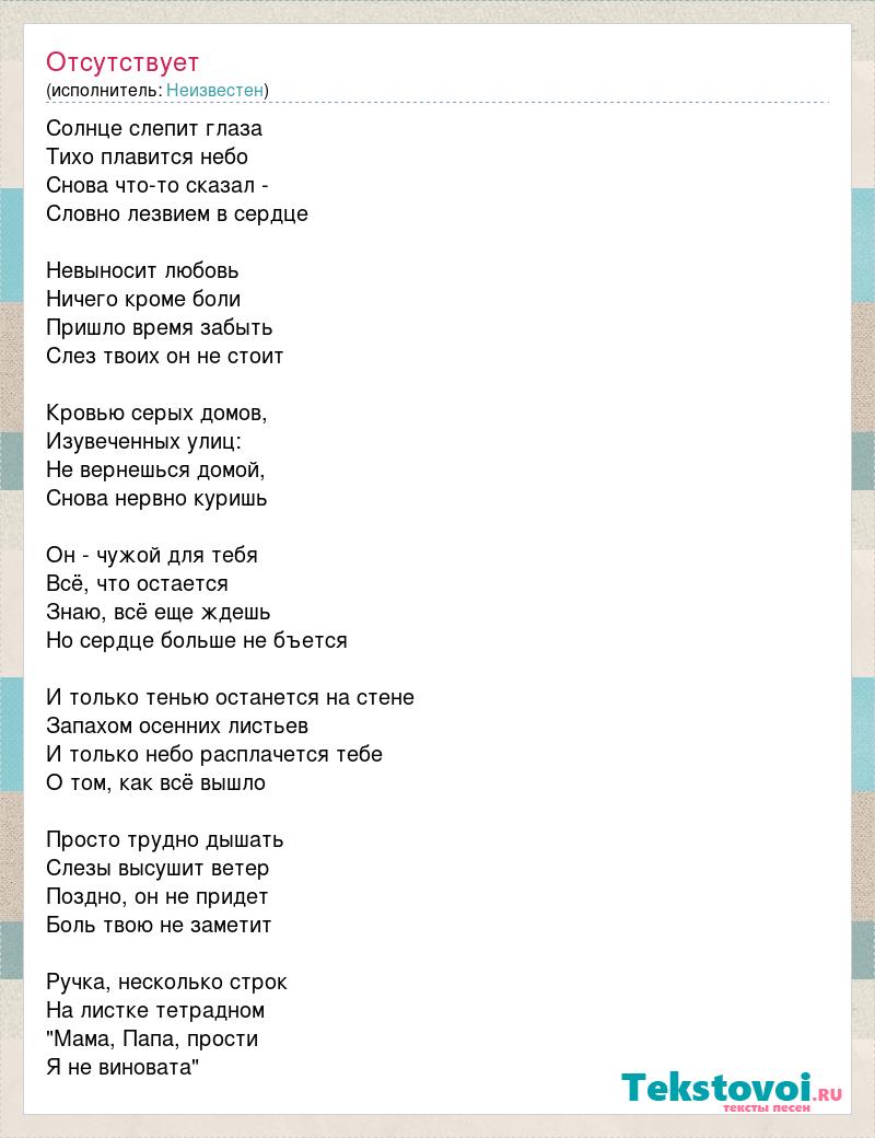 Солнце слепит глаза Тихо плавится небо Снова что-то сказал - Словно лезвием в сердце Невыносит любовь Ничего кроме боли Пришло время забыть Слез твоих он не стоит Кровью серых домов, Изувеченных улиц: Не вернешься домой, Снова нервно куришь Он - чужой для тебя Всё, что остается Знаю, всё еще ждешь Но сердце больше не бъется И только тенью останется на стене Запахом осенних листьев И только небо расплачется тебе О том, как всё вышло Просто трудно дышать Слезы высушит ветер Поздно, он не придет Боль твою не заметит Ручка, несколько строк На листке тетрадном "Мама, Папа, прости Я не виновата"