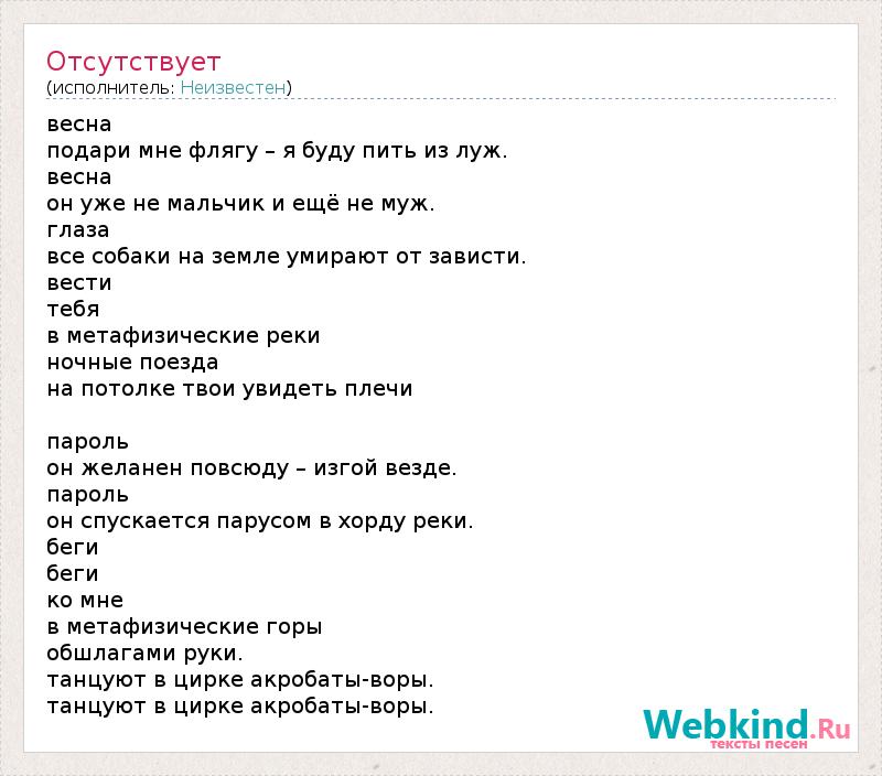 весна подари мне флягу – я буду пить из луж. весна он уже не мальчик и ещё не муж. глаза все собаки на земле умирают от зависти. вести тебя в метафизические реки ночные поезда на потолке твои увидеть плечи пароль он желанен повсюду – изгой везде. пароль он спускается парусом в хорду реки. беги беги ко мне в метафизические горы обшлагами руки. танцуют в цирке акробаты-воры. танцуют в цирке акробаты-воры.