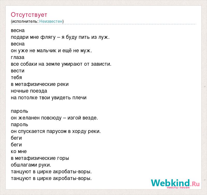 весна подари мне флягу – я буду пить из луж. весна он уже не мальчик и ещё не муж. глаза все собаки на земле умирают от зависти. вести тебя в метафизические реки ночные поезда на потолке твои увидеть плечи пароль он желанен повсюду – изгой везде. пароль он спускается парусом в хорду реки. беги беги ко мне в метафизические горы обшлагами руки. танцуют в цирке акробаты-воры. танцуют в цирке акробаты-воры.