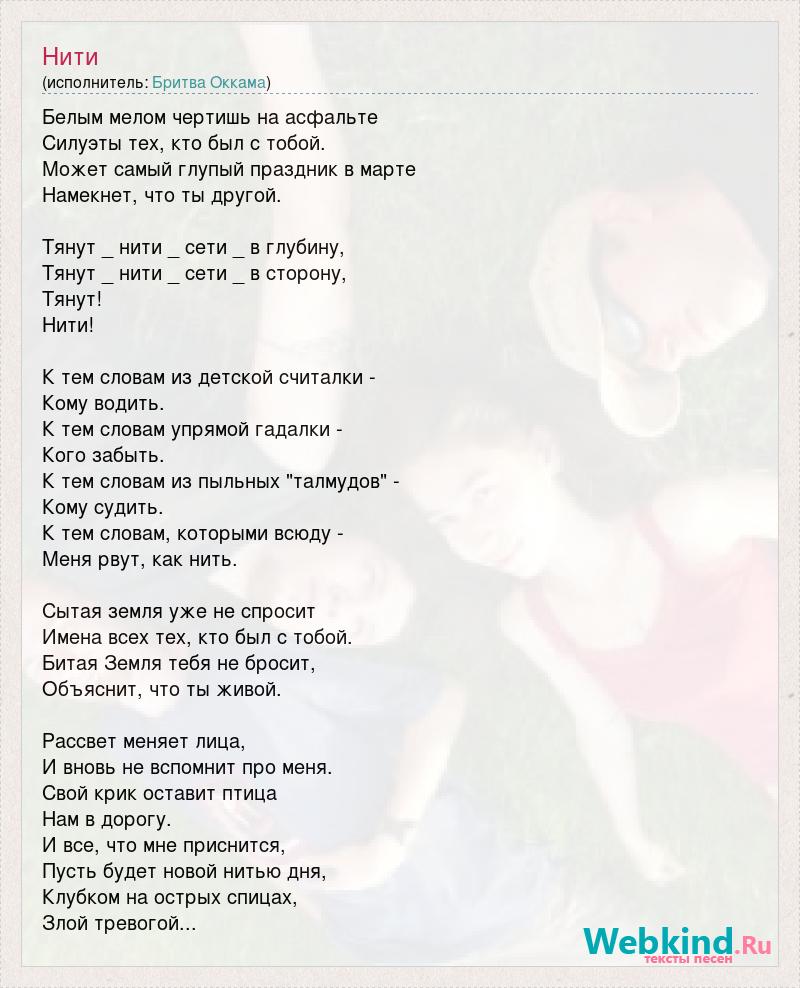 Белым мелом чертишь на асфальте Силуэты тех, кто был с тобой. Может самый глупый праздник в марте Намекнет, что ты другой. Тянут _ нити _ сети _ в глубину, Тянут _ нити _ сети _ в сторону, Тянут! Нити! К тем словам из детской считалки - Кому водить. К тем словам упрямой гадалки - Кого забыть. К тем словам из пыльных "талмудов" - Кому судить. К тем словам, которыми всюду - Меня рвут, как нить. Сытая земля уже не спросит Имена всех тех, кто был с тобой. Битая Земля тебя не бросит, Объяснит, что ты живой. Рассвет меняет лица, И вновь не вспомнит про меня. Свой крик оставит птица Нам в дорогу. И все, что мне приснится, Пусть будет новой нитью дня, Клубком на острых спицах, Злой тревогой...