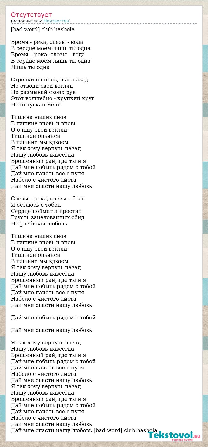 [bad word] club.hasbola Время - река, слезы - вода В сердце моем лишь ты одна Время – река, слезы – вода В сердце моем лишь ты одна Лишь ты одна Стрелки на ноль, шаг назад Не отводи свой взгляд Не размыкай своих рук Этот волшебно - хрупкий круг Не отпускай меня Тишина наших снов В тишине вновь и вновь О-о ищу твой взгляд Тишиной опьянен В тишине мы вдвоем Я так хочу вернуть назад Нашу любовь навсегда Брошенный рай, где ты и я Дай мне побыть рядом с тобой Дай мне начать все с нуля Набело с чистого листа Дай мне спасти нашу любовь Слезы – река, слезы – боль Я остаюсь с тобой Сердце поймет и простит Грусть зацелованных обид Не разбивай любовь Тишина наших снов В тишине вновь и вновь О-о ищу твой взгляд Тишиной опьянен В тишине мы вдвоем Я так хочу вернуть назад Нашу любовь навсегда Брошенный рай, где ты и я Дай мне побыть рядом с тобой Дай мне начать все с нуля Набело с чистого листа Дай мне спасти нашу любовь Дай мне побыть рядом с тобой Дай мне спасти нашу любовь Я так хочу вернуть назад Нашу любовь навсегда Брошенный рай, где ты и я Дай мне побыть рядом с тобой Дай мне начать все с нуля Набело с чистого листа Дай мне спасти нашу любовь Я так хочу вернуть назад Нашу любовь навсегда Брошенный рай, где ты и я Дай мне побыть рядом с тобой Дай мне начать все с нуля Набело с чистого листа Дай мне спасти нашу любовь Дай мне спасти нашу любовь [bad word] club.hasbola