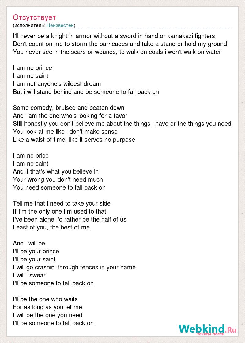 I'll never be a knight in armor without a sword in hand or kamakazi fighters Don't count on me to storm the barricades and take a stand or hold my ground You never see in the scars or wounds, to walk on coals i won't walk on water I am no prince I am no saint I am not anyone's wildest dream But i will stand behind and be someone to fall back on [bad word] [bad word] and beaten down And i am the one who's looking for a favor Still honestly you don't believe me about the things i have or the things you need You look at me like i don't make sense Like a waist of time, like it serves no purpose I am no price I am no saint And if that's what you believe in Your wrong you don't need much You need someone to fall back on Tell me that i need to take your side If I'm the only one I'm used to that I've been alone I'd rather be the half of us Least of you, the best of me And i will be I'll be your prince I'll be your saint I will go crashin' through fences in your name I will i swear I'll be someone to fall back on I'll be the one who waits For as long as you let me I will be the one you need I'll be someone to fall back on