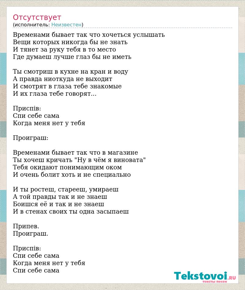 Временами бывает так что хочеться услышать Вещи которых никогда бы не знать И тянет за руку тебя в то место Где думаеш лучше глаз бы не иметь Ты смотриш в кухне на кран и воду А правда ниоткуда не выходит И смотрят в глаза тебе знакомые И их глаза тебе говорят... Приспів: Спи себе сама Когда меня нет у тебя Проиграш: Временами бывает так что в магазине Ты хочеш кричать "Ну в чём я виновата" Тебя окидают понимающим оком И очень болит хоть и не специально И ты ростеш, старееш, умираеш А той правды так и не знаеш Боишся её и так и не знаеш И в стенах своих ты одна засыпаеш Припев. Проиграш. Приспів: Спи себе сама Когда меня нет у тебя Спи себе сама