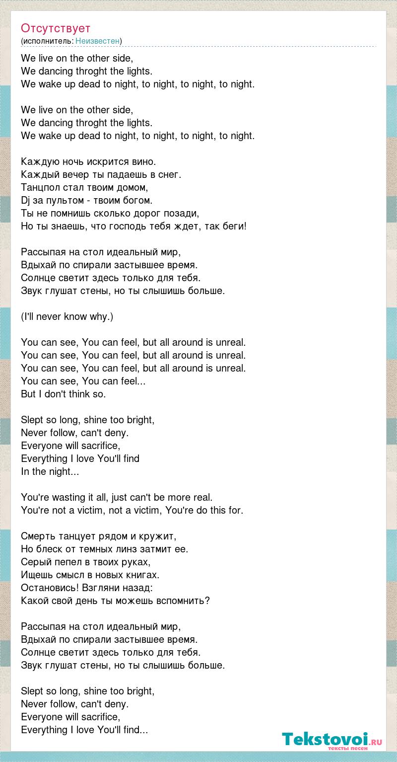 We live on the other side, We dancing throght the lights. We wake up dead to night, to night, to night, to night. We live on the other side, We dancing throght the lights. We wake up dead to night, to night, to night, to night. Каждую ночь искрится вино. Каждый вечер ты падаешь в снег. Танцпол стал твоим домом, Dj за пультом - твоим богом. Ты не помнишь сколько дорог позади, Но ты знаешь, что господь тебя ждет, так беги! Рассыпая на стол идеальный мир, Вдыхай по спирали застывшее время. Солнце светит здесь только для тебя. Звук глушат стены, но ты слышишь больше. (I'll never know why.) You can see, You can feel, but all around is unreal. You can see, You can feel, but all around is unreal. You can see, You can feel, but all around is unreal. You can see, You can feel... But I don't think so. Slept so long, shine too bright, Never follow, can't deny. Everyone will sacrifice, Everything I love You'll find In the night... You're wasting it all, just can't be more real. You're not a victim, not a victim, You're do this for. Смерть танцует рядом и кружит, Но блеск от темных линз затмит ее. Серый пепел в твоих руках, Ищешь смысл в новых книгах. Остановись! Взгляни назад: Какой свой день ты можешь вспомнить? Рассыпая на стол идеальный мир, Вдыхай по спирали застывшее время. Солнце светит здесь только для тебя. Звук глушат стены, но ты слышишь больше. Slept so long, shine too bright, Never follow, can't deny. Everyone will sacrifice, Everything I love You'll find...