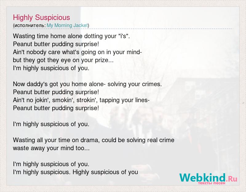 Wasting time home alone dotting your "i's". Peanut butter pudding surprise! Ain't nobody care what's going on in your mind- but they got they eye on your prize... I'm highly suspicious of you. Now daddy's got you home alone- solving your crimes. Peanut butter pudding surprise! Ain't no jokin', smokin', strokin', tapping your lines- Peanut butter pudding surprise! I'm highly suspicious of you. Wasting all your time on drama, could be solving real crime waste away your mind too... I'm highly suspicious of you. I'm highly suspicious. Highly suspicious of you
