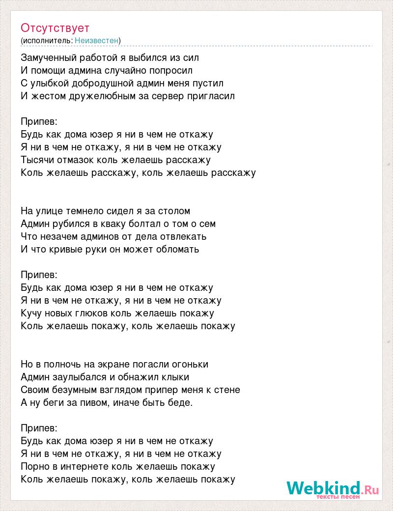 Замученный работой я выбился из сил И помощи админа случайно попросил С улыбкой добродушной админ меня пустил И жестом дружелюбным за сервер пригласил Припев: Будь как дома юзер я ни в чем не откажу Я ни в чем не откажу, я ни в чем не откажу Тысячи отмазок коль желаешь расскажу Коль желаешь расскажу, коль желаешь расскажу На улице темнело сидел я за столом Админ рубился в кваку болтал о том о сем Что незачем админов от дела отвлекать И что кривые руки он может обломать Припев: Будь как дома юзер я ни в чем не откажу Я ни в чем не откажу, я ни в чем не откажу Кучу новых глюков коль желаешь покажу Коль желаешь покажу, коль желаешь покажу Но в полночь на экране погасли огоньки Админ заулыбался и обнажил клыки Своим безумным взглядом припер меня к стене А ну беги за пивом, иначе быть беде. Припев: Будь как дома юзер я ни в чем не откажу Я ни в чем не откажу, я ни в чем не откажу Порно в интернете коль желаешь покажу Коль желаешь покажу, коль желаешь покажу