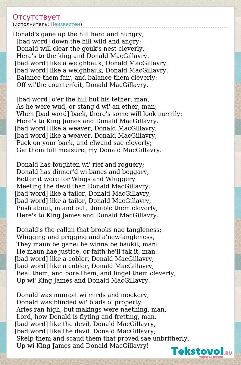 Donald's gane up the hill hard and hungry, [bad word] down the hill wild and angry; Donald will clear the gouk's nest cleverly, Here's to the king and Donald MacGillavry. [bad word] like a weighbauk, Donald MacGillavry, [bad word] like a weighbauk, Donald MacGillavry, Balance them fair, and balance them cleverly: Off wi'the counterfeit, Donald MacGillavry. [bad word] o'er the hill but his tether, man, As he were wud, or stang'd wi' an ether, man; When [bad word] back, there's some will look merrily: Here's to King James and Donald MacGillavry. [bad word] like a weaver, Donald MacGillavry, [bad word] like a weaver, Donald MacGillavry, Pack on your back, and elwand sae cleverly; Gie them full measure, my Donald MacGillavry. Donald has foughten wi' rief and roguery; Donald has dinner'd wi banes and beggary, Better it were for Whigs and Whiggery Meeting the devil than Donald MacGillavry. [bad word] like a tailor, Donald MacGillavry, [bad word] like a tailor, Donald MacGillavry, Push about, in and out, thimble them cleverly, Here's to King James and Donald MacGillavry. Donald's the callan that brooks nae tangleness; Whigging and prigging and a'newfangleness, They maun be gane: he winna be baukit, man: He maun hae justice, or faith he'll tak it, man. [bad word] like a cobler, Donald MacGillavry, [bad word] like a cobler, Donald MacGillavry; Beat them, and bore them, and lingel them cleverly, Up wi' King James and Donald MacGillavry. Donald was mumpit wi mirds and mockery; Donald was blinded wi' blads o' property; Arles ran high, but makings were naething, man, Lord, how Donald is flyting and fretting, man. [bad word] like the devil, Donald MacGillavry, [bad word] like the devil, Donald MacGillavry; Skelp them and scaud them that proved sae unbritherly, Up wi King James and Donald MacGillavry!