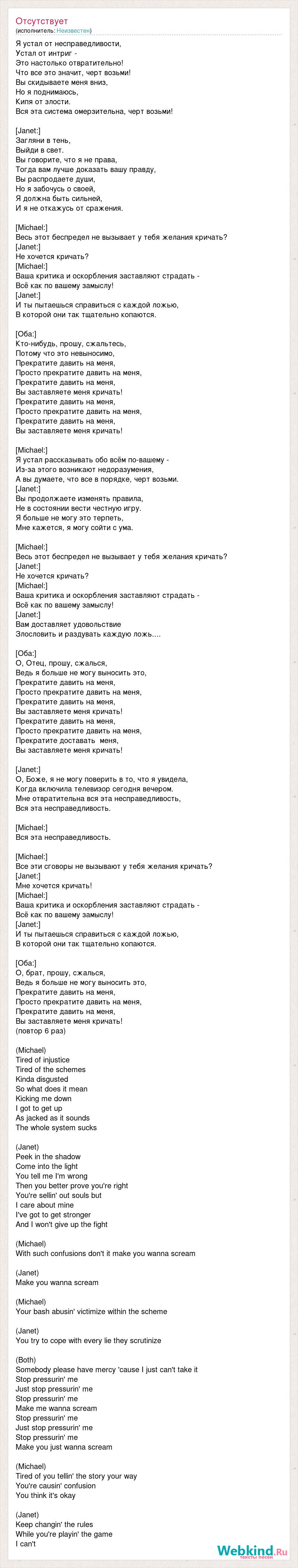 Я устал от несправедливости, Устал от интриг - Это настолько отвратительно! Что все это значит, черт возьми! Вы скидываете меня вниз, Но я поднимаюсь, Кипя от злости. Вся эта система омерзительна, черт возьми! [Janet:] Загляни в тень, Выйди в свет. Вы говорите, что я не права, Тогда вам лучше доказать вашу правду, Вы распродаете души, Но я забочусь о своей, Я должна быть сильней, И я не откажусь от сражения. [Michael:] Весь этот беспредел не вызывает у тебя желания кричать? [Janet:] Не хочется кричать? [Michael:] Ваша критика и оскорбления заставляют страдать - Всё как по вашему замыслу! [Janet:] И ты пытаешься справиться с каждой ложью, В которой они так тщательно копаются. [Оба:] Кто-нибудь, прошу, сжальтесь, Потому что это невыносимо, Прекратите давить на меня, Просто прекратите давить на меня, Прекратите давить на меня, Вы заставляете меня кричать! Прекратите давить на меня, Просто прекратите давить на меня, Прекратите давить на меня, Вы заставляете меня кричать! [Michael:] Я устал рассказывать обо всём по-вашему - Из-за этого возникают недоразумения, А вы думаете, что все в порядке, черт возьми. [Janet:] Вы продолжаете изменять правила, Не в состоянии вести честную игру. Я больше не могу это терпеть, Мне кажется, я могу сойти с ума. [Michael:] Весь этот беспредел не вызывает у тебя желания кричать? [Janet:] Не хочется кричать? [Michael:] Ваша критика и оскорбления заставляют страдать - Всё как по вашему замыслу! [Janet:] Вам доставляет удовольствие Злословить и раздувать каждую ложь.... [Оба:] О, Отец, прошу, сжалься, Ведь я больше не могу выносить это, Прекратите давить на меня, Просто прекратите давить на меня, Прекратите давить на меня, Вы заставляете меня кричать! Прекратите давить на меня, Просто прекратите давить на меня, Прекратите доставать меня, Вы заставляете меня кричать! [Janet:] О, Боже, я не могу поверить в то, что я увидела, Когда включила телевизор сегодня вечером. Мне отвратительна вся эта несправедливость, Вся эта несправедливость. [Michael:] Вся эта несправедливость. [Michael:] Все эти сговоры не вызывают у тебя желания кричать? [Janet:] Мне хочется кричать! [Michael:] Ваша критика и оскорбления заставляют страдать - Всё как по вашему замыслу! [Janet:] И ты пытаешься справиться с каждой ложью, В которой они так тщательно копаются. [Оба:] О, брат, прошу, сжалься, Ведь я больше не могу выносить это, Прекратите давить на меня, Просто прекратите давить на меня, Прекратите давить на меня, Вы заставляете меня кричать! (повтор 6 раз) (Michael) Tired of injustice Tired of the schemes Kinda disgusted So what does it mean Kicking me down I got to get up As jacked as it sounds The whole system sucks (Janet) Peek in the [bad word] into the light You tell me I'm wrong Then you better prove you're right You're sellin' out souls but I care about mine I've got to get stronger And I won't give up the fight (Michael) With such confusions don't it make you wanna scream (Janet) Make you wanna scream (Michael) Your bash abusin' victimize within the scheme (Janet) You try to cope with every lie they [bad word] (Both) Somebody please have mercy 'cause I just can't take it Stop pressurin' me Just stop pressurin' me Stop pressurin' me Make me wanna scream Stop pressurin' me Just stop pressurin' me Stop pressurin' me Make you just wanna scream (Michael) Tired of you tellin' the story your way You're causin' confusion You think it's okay (Janet) Keep changin' [bad word] While you're playin' the game I can't