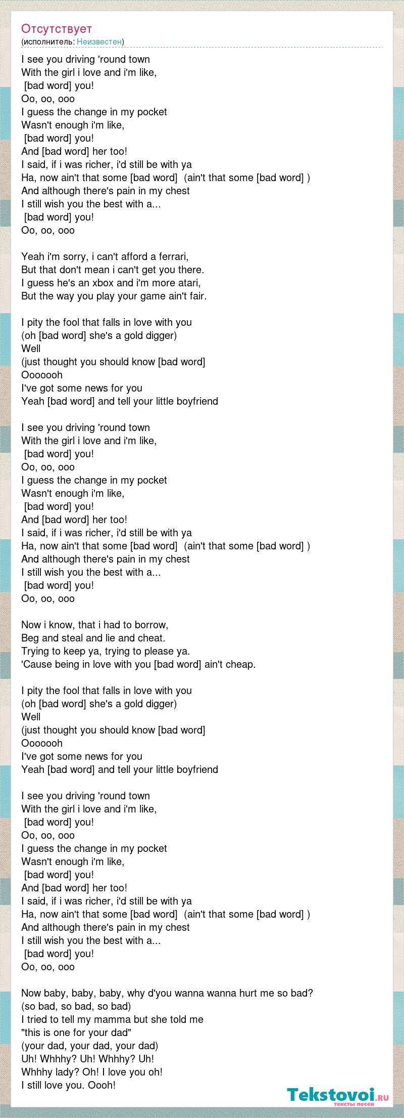 I see you driving 'round town With the girl i love and i'm like, [bad word] you! Oo, oo, ooo I guess the change in my pocket Wasn't enough i'm like, [bad word] you! And [bad word] her too! I said, if i was richer, i'd still be with ya Ha, now ain't that some [bad word] (ain't that some [bad word] ) And although there's pain in my chest I still wish you the best with a... [bad word] you! Oo, oo, ooo Yeah i'm sorry, i can't afford a ferrari, But that don't mean i can't get you there. I guess he's an xbox and i'm more atari, But the way you play your game ain't fair. I pity the fool that falls in love with you (oh [bad word] she's a gold digger) Well (just thought you should know [bad word] Ooooooh I've got some news for you Yeah [bad word] and tell your little boyfriend I see you driving 'round town With the girl i love and i'm like, [bad word] you! Oo, oo, ooo I guess the change in my pocket Wasn't enough i'm like, [bad word] you! And [bad word] her too! I said, if i was richer, i'd still be with ya Ha, now ain't that some [bad word] (ain't that some [bad word] ) And although there's pain in my chest I still wish you the best with a... [bad word] you! Oo, oo, ooo Now i know, that i had to borrow, Beg and steal and lie and cheat. Trying to keep ya, trying to please ya. 'Cause being in love with you [bad word] ain't cheap. I pity the fool that falls in love with you (oh [bad word] she's a gold digger) Well (just thought you should know [bad word] Ooooooh I've got some news for you Yeah [bad word] and tell your little boyfriend I see you driving 'round town With the girl i love and i'm like, [bad word] you! Oo, oo, ooo I guess the change in my pocket Wasn't enough i'm like, [bad word] you! And [bad word] her too! I said, if i was richer, i'd still be with ya Ha, now ain't that some [bad word] (ain't that some [bad word] ) And although there's pain in my chest I still wish you the best with a... [bad word] you! Oo, oo, ooo Now baby, baby, baby, why d'you wanna wanna hurt me so bad? (so bad, so bad, so bad) I tried to tell my mamma but she told me "this is one for your dad" (your dad, your dad, your dad) Uh! Whhhy? Uh! Whhhy? Uh! Whhhy lady? Oh! I love you oh! I still love you. Oooh!