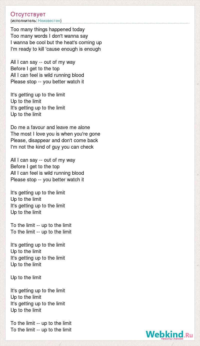 Too many things happened today Too many words I don't wanna say I wanna be cool but the [bad word] up I'm ready to kill 'cause enough is enough All I can say -- out of my way Before I get to the top All I can feel is [bad word] blood Please stop -- you better watch it It's getting up to the limit Up to the limit It's getting up to the limit Up to the limit Do me a favour and leave me alone The most I love you is when you're gone Please, disappear and [bad word] back I'm not the kind of guy you can check All I can say -- out of my way Before I get to the top All I can feel is [bad word] blood Please stop -- you better watch it It's getting up to the limit Up to the limit It's getting up to the limit Up to the limit To the limit -- up to the limit To the limit -- up to the limit It's getting up to the limit Up to the limit It's getting up to the limit Up to the limit Up to the limit It's getting up to the limit Up to the limit It's getting up to the limit Up to the limit To the limit -- up to the limit To the limit -- up to the limit