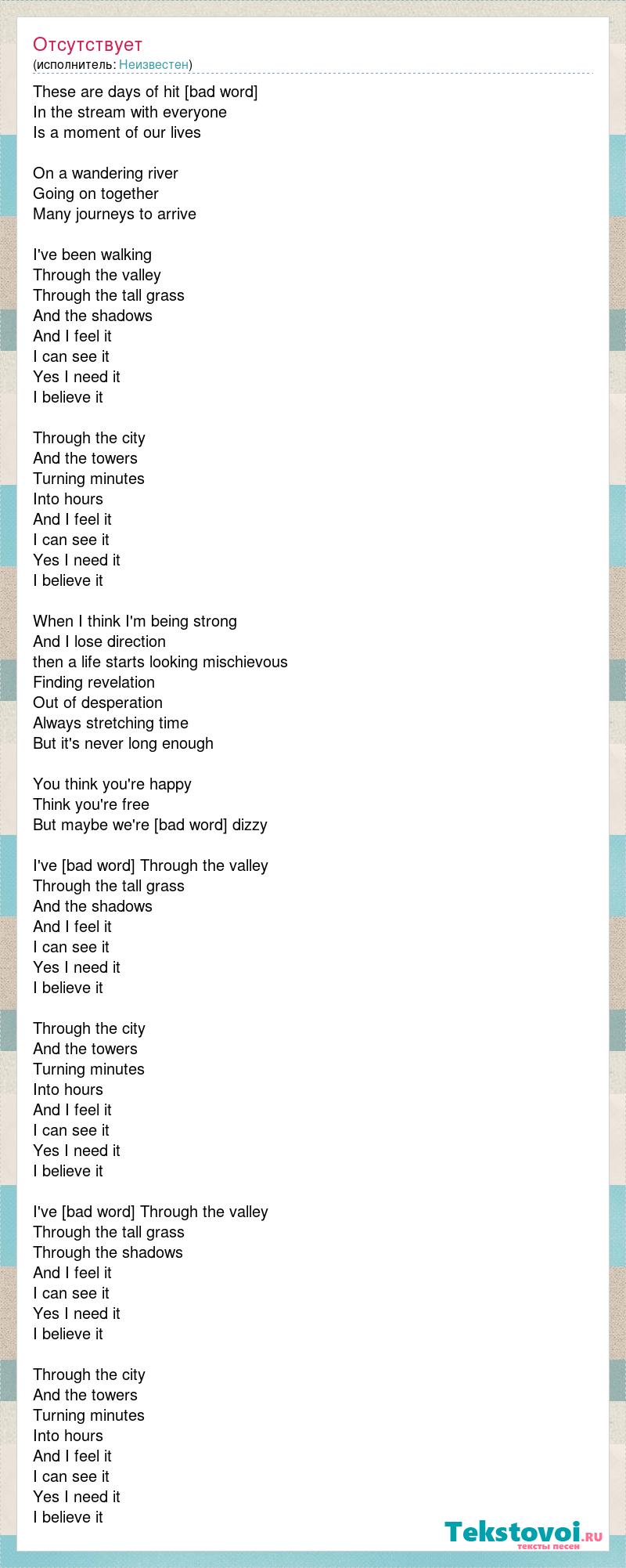 These are days of hit [bad word] In the stream with everyone Is a moment of our lives On a wandering river Going on together Many journeys to arrive I've been walking Through the valley Through the tall grass And the shadows And I feel it I can see it Yes I need it I believe it Through the city And the towers Turning minutes Into hours And I feel it I can see it Yes I need it I believe it When I think I'm being strong And I lose direction then a life starts looking mischievous Finding revelation Out of desperation Always stretching time But it's never long enough You think you're happy Think you're free But maybe we're [bad word] dizzy I've [bad word] Through the valley Through the tall grass And the shadows And I feel it I can see it Yes I need it I believe it Through the city And the towers Turning minutes Into hours And I feel it I can see it Yes I need it I believe it I've [bad word] Through the valley Through the tall grass Through the shadows And I feel it I can see it Yes I need it I believe it Through the city And the towers Turning minutes Into hours And I feel it I can see it Yes I need it I believe it