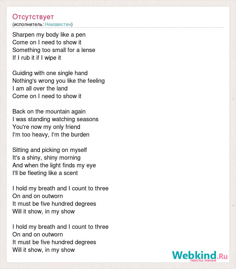 Sharpen my body like a [bad word] on I need to show it Something too small for a lense If [bad word] it if I wipe it Guiding with one single hand Nothing's wrong you like the feeling I am all over the [bad word] on I need to show it Back on the mountain again I was standing watching seasons You're now my only friend I'm too heavy, I'm the burden Sitting and picking on myself It's a shiny, shiny morning And when the light finds my eye I'll be fleeting like a scent I hold my breath and I count to three On and on outworn It must be five hundred degrees Will it show, in my show I hold my breath and I count to three On and on outworn It must be five hundred degrees Will it show, in my show