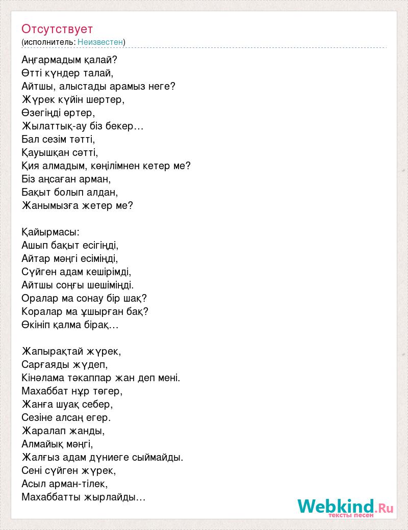 Аңғармадым қалай? Өтті күндер талай, Айтшы, алыстады арамыз неге? Жүрек күйін шертер, Өзегіңді өртер, Жылаттық-ау біз бекер… Бал сезім тәтті, Қауышқан сәтті, Қия алмадым, көңілімнен кетер ме? Біз аңсаған арман, Бақыт болып алдан, Жанымызға жетер ме? Қайырмасы: Ашып бақыт есігіңді, Айтар мәңгі есіміңді, Сүйген адам кешірімді, Айтшы соңғы шешіміңді. Оралар ма сонау бір шақ? Коралар ма ұшырған бақ? Өкініп қалма бірақ… Жапырақтай жүрек, Сарғаяды жүдеп, Кінәлама тәкаппар жан деп мені. Махаббат нұр төгер, Жанға шуақ себер, Сезіне алсаң егер. Жаралап жанды, Алмайық мәңгі, Жалғыз адам дүниеге сыймайды. Сені сүйген жүрек, Асыл арман-тілек, Махаббатты жырлайды…