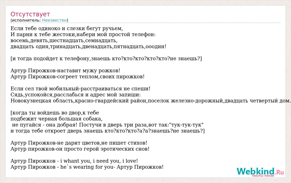 Если тебе одиноко и слезки бегут ручьем, И парни к тебе жестоки,набери мой простой телефон: восемь,девять,шестнадцать,семнадцать, двадцать один,тринадцать,двенадцать,пятнадцать,ооодин! [и тогда подойдет к телефону,знаешь кто?кто?кто?кто?кто?не знаешь?] Артур Пирожков-наставит мужу рожков! Артур Пирожков-согреет теплом,своих пирожков! Если сел твой мобильный-расстраиваться не спеши! Сядь,успокойся,расслабься и адрес мой запиши: Новокузнецкая область,красно-гвардейский район,поселок железно-дорожный,двадцать четвертый дом. [когда ты войдешь во двор,к тебе подбежит черная большая собака, не пугайся - она добрая! Постучи в дверь три раза,вот так:"тук-тук-тук" и тогда тебе откроет дверь знаешь кто?кто?кто?а?а?знаешь?не знаешь?] Артур Пирожков-не дарит цветов,не пишет стихов! Артур пирожков-он просто герой эротических снов! Артур Пирожков - i whant you, i need you, i love! Артур Пирожков - he`s wearing for you- Артур Пирожков!
