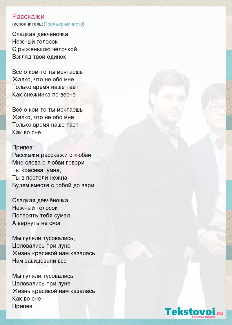 Сладкая девчёночка Нежный голосок С рыженькою чёлочкой Взгляд твой одинок Всё о ком-то ты мечтаешь Жалко, что не обо мне Только время наше тает Как снежинка по весне Всё о ком-то ты мечтаешь Жалко, что не обо мне Только время наше тает Как во сне Припев: Расскажи,расскажи о любви Мне слова о любви говори Ты красива, умна, Ты в постели нежна Будем вместе с тобой до зари Сладкая девчёночка Нежный голосок Потерять тебя сумел А вернуть не смог Мы гуляли,тусовались, Целовались при луне Жизнь красивой нам казалась Нам завидовали все Мы гуляли,тусовались Целовались при луне Жизнь красивой нам казалась Как во сне Припев.