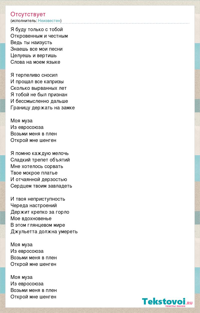 Я буду только с тобой Откровенным и честным Ведь ты наизусть Знаешь все мои песни Целуешь и вертишь Слова на моем языке Я терпеливо сносил И прощал все капризы Сколько вырванных лет Я тобой не был признан И бессмысленно дальше Границу держать на замке Моя муза Из евросоюза Возьми меня в плен Открой мне шенген Я помню каждую мелочь Сладкий трепет объятий Мне хотелось сорвать Твое мокрое платье И отчаянной дерзостью Сердцем твоим завладеть И твоя неприступность Череда настроений Держит крепко за горло Мое вдохновенье В этом глянцевом мире Джульетта должна умереть Моя муза Из евросоюза Возьми меня в плен Открой мне шенген Моя муза Из евросоюза Возьми меня в плен Открой мне шенген