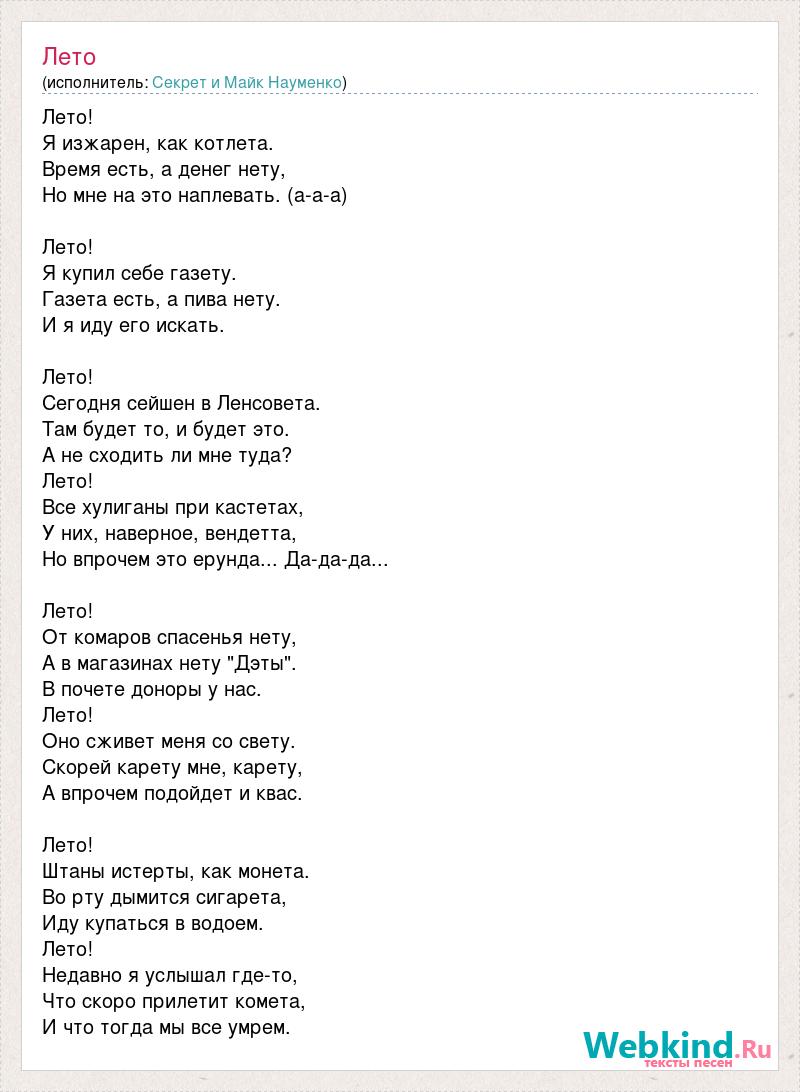 Лето! Я изжарен, как котлета. Время есть, а денег нету, Но мне на это наплевать. (а-а-а) Лето! Я купил себе газету. Газета есть, а пива нету. И я иду его искать. Лето! Сегодня сейшен в Ленсовета. Там будет то, и будет это. А не сходить ли мне туда? Лето! Все хулиганы при кастетах, У них, наверное, вендетта, Но впрочем это ерунда... Да-да-да... Лето! От комаров спасенья нету, А в магазинах нету "Дэты". В почете доноры у нас. Лето! Оно сживет меня со свету. Скорей карету мне, карету, А впрочем подойдет и квас. Лето! Штаны истерты, как монета. Во рту дымится сигарета, Иду купаться в водоем. Лето! Недавно я услышал где-то, Что скоро прилетит комета, И что тогда мы все умрем.