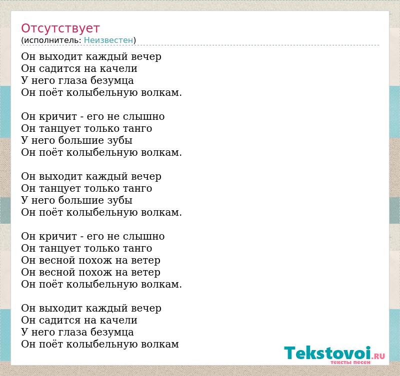 Он выходит каждый вечер Он садится на качели У него глаза безумца Он поёт колыбельную волкам. Он кричит - его не слышно Он танцует только танго У него большие зубы Он поёт колыбельную волкам. Он выходит каждый вечер Он танцует только танго У него большие зубы Он поёт колыбельную волкам. Он кричит - его не слышно Он танцует только танго Он весной похож на ветер Он весной похож на ветер Он поёт колыбельную волкам. Он выходит каждый вечер Он садится на качели У него глаза безумца Он поёт колыбельную волкам