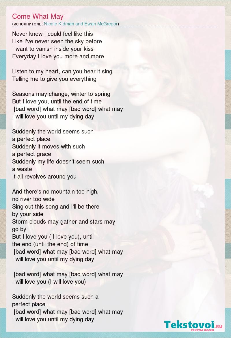 Never knew I could feel like this Like I've never seen the sky before I want to vanish inside your kiss Everyday I love you more and more Listen to my heart, can you hear it sing Telling me to give you everything Seasons may change, winter to spring But I love you, until the end of time [bad word] what may [bad word] what may I will love you until my dying day Suddenly the world seems such a perfect place Suddenly it moves with such a perfect grace Suddenly my life doesn't seem such a waste It all revolves around you And there's no mountain too high, no river too wide Sing out this song and I'll be there by your side Storm clouds may gather and stars may go by But I love you ( I love you), until the end (until the end) of time [bad word] what may [bad word] what may I will love you until my dying day [bad word] what may [bad word] what may I will love you (I will love you) Suddenly the world seems such a perfect place [bad word] what may [bad word] what may I will love you until my dying day