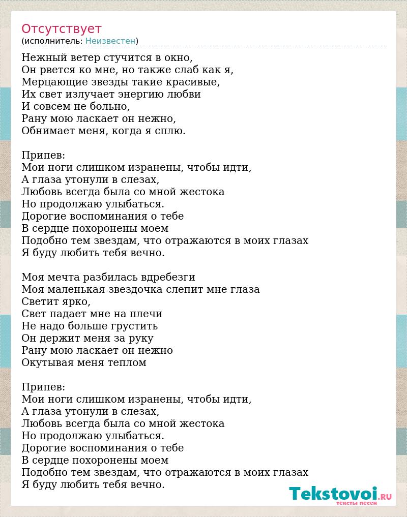 Нежный ветер стучится в окно, Он рвется ко мне, но также слаб как я, Мерцающие звезды такие красивые, Их свет излучает энергию любви И совсем не больно, Рану мою ласкает он нежно, Обнимает меня, когда я сплю. Припев: Мои ноги слишком изранены, чтобы идти, А глаза утонули в слезах, Любовь всегда была со мной жестока Но продолжаю улыбаться. Дорогие воспоминания о тебе В сердце похоронены моем Подобно тем звездам, что отражаются в моих глазах Я буду любить тебя вечно. Моя мечта разбилась вдребезги Моя маленькая звездочка слепит мне глаза Светит ярко, Свет падает мне на плечи Не надо больше грустить Он держит меня за руку Рану мою ласкает он нежно Окутывая меня теплом Припев: Мои ноги слишком изранены, чтобы идти, А глаза утонули в слезах, Любовь всегда была со мной жестока Но продолжаю улыбаться. Дорогие воспоминания о тебе В сердце похоронены моем Подобно тем звездам, что отражаются в моих глазах Я буду любить тебя вечно.