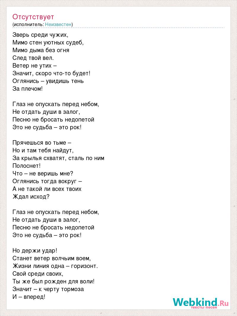 Зверь среди чужих, Мимо стен уютных судеб, Мимо дыма без огня След твой вел. Ветер не утих – Значит, скоро что-то будет! Оглянись – увидишь тень За плечом! Глаз не опускать перед небом, Не отдать души в залог, Песню не бросать недопетой Это не судьба – это рок! Прячешься во тьме – Но и там тебя найдут, За крылья схватят, сталь по ним Полоснет! Что – не веришь мне? Оглянись тогда вокруг – А не такой ли всех твоих Ждал исход? Глаз не опускать перед небом, Не отдать души в залог, Песню не бросать недопетой Это не судьба – это рок! Но держи удар! Станет ветер волчьим воем, Жизни линия одна – горизонт. Свой среди своих, Ты же был рожден для воли! Значит – к черту тормоза И – вперед!