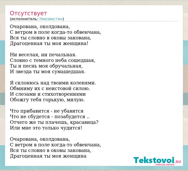 Очарована, околдована, С ветром в поле когда-то обвенчана, Вся ты словно в оковы закована, Драгоценная ты моя женщина! Ни веселая, ни печальная. Словно с темного неба сошедшая, Ты и песнь моя обручальная, И звезда ты моя сумашедшая. Я склонюсь над твоими коленями. Обмниму их с неистовой силою. И слезами и стихотворениями Обожгу тебя горькую, милую. Что прибавится - не убавится Что не сбудется - позабудется .. Отчего же ты плачешь, красавица? Или мне это только чудится! Очарована, околдована, С ветром в поле когда-то обвенчана, Вся ты словно в оковы закована, Драгоценная ты моя женщина