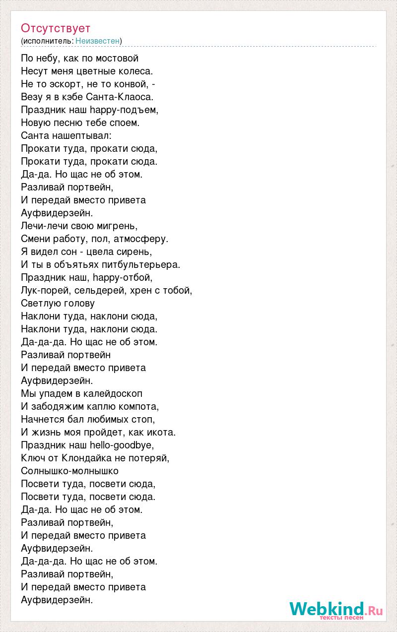 По небу, как по мостовой Несут меня цветные колеса. Не то эскорт, не то конвой, - Везу я в кэбе Санта-Клаоса. Праздник наш happy-подъем, Новую песню тебе споем. Санта нашептывал: Прокати туда, прокати сюда, Прокати туда, прокати сюда. Да-да. Но щас не об этом. Разливай портвейн, И передай вместо привета Ауфвидерзейн. Лечи-лечи свою мигрень, Смени работу, пол, атмосферу. Я видел сон - цвела сирень, И ты в объятьях питбультерьера. Праздник наш, happy-отбой, Лук-порей, сельдерей, хрен с тобой, Светлую голову Наклони туда, наклони сюда, Наклони туда, наклони сюда. Да-да-да. Но щас не об этом. Разливай портвейн И передай вместо привета Ауфвидерзейн. Мы упадем в калейдоскоп И забодяжим каплю компота, Начнется бал любимых стоп, И жизнь моя пройдет, как икота. Праздник наш hello-goodbye, Ключ от Клондайка не потеряй, Солнышко-молнышко Посвети туда, посвети сюда, Посвети туда, посвети сюда. Да-да. Но щас не об этом. Разливай портвейн, И передай вместо привета Ауфвидерзейн. Да-да-да. Но щас не об этом. Разливай портвейн, И передай вместо привета Ауфвидерзейн.